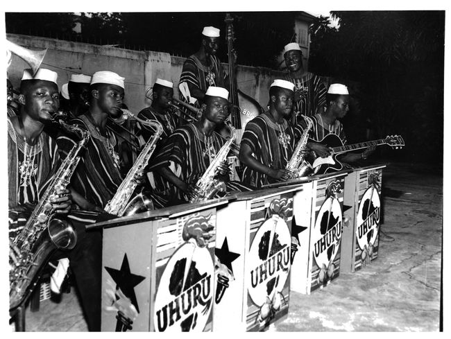 The Uhuru Dance Band, a state-endorsed highlife band supported by the Arts Council of Ghana, performs wearing the traditional fugu to adhere to Nkrumah’s “African Personality,” 1963. Image from Nate Plageman, “The African Personality Dances Highlife,” 2014. Courtesy Nate Plageman © Information Services Department of Ghana Photograph Library