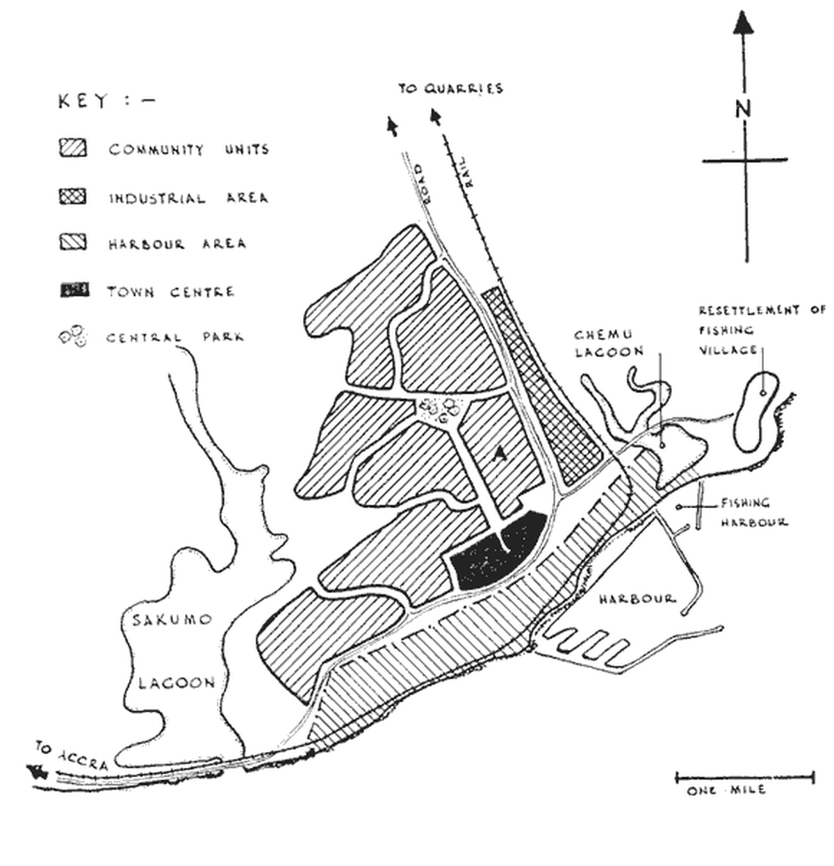 For more on the history of Tema and its modernist planning, see Michelle Provoost, “Exporting New Towns: The Welfare City in Africa,” International New Town Institute, 2015, http://www.newtowninstitute.org/spip.php?article1046. ↩
