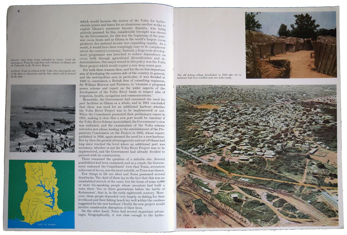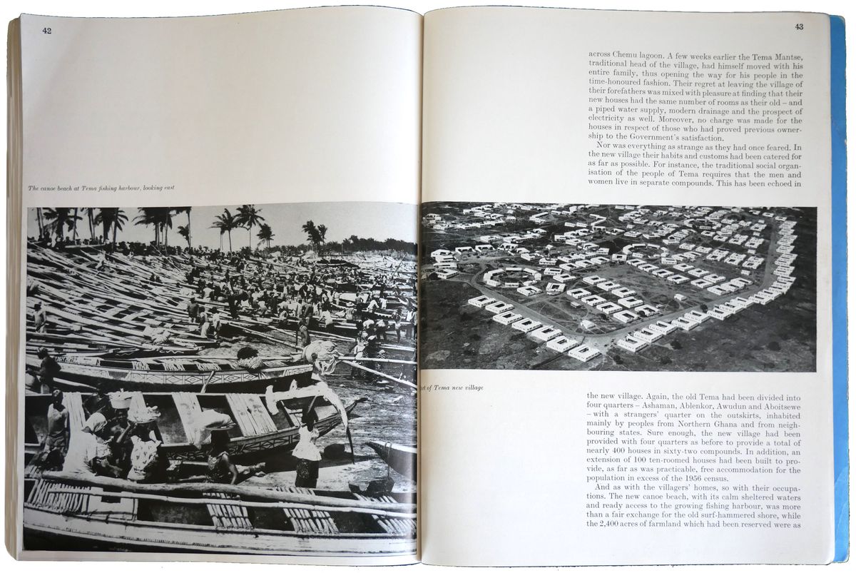 Even as the Seegers were filming, another nearby fishing town called Tema was being rapidly transformed by the construction of an advanced deep-water seaport. From the perspective of the longue durée, the evolution of West Africa’s coastal architecture has been defined by the emergence of logistical planning.1 This lineage began with the trading posts of the early fifteenth century, where European merchants exchanged goods and commodities with societies along the Guinea coast—sites that soon became the ports and castles central to managing the flow of bodies within the Atlantic slave trade. From the nineteenth century on, these coastal hubs became the critical infrastructures of colonial rule, where railway lines emerging from deep inland converged to efficiently extract natural resources. Finally, in the twentieth century, the harbours were expanded into mega seaports capable of supplying the growing local consumer market with imported, manufactured goods and increasing the export of raw materials. The development of Tema Harbour, begun during the late colonial period and accelerated after independence, therefore represents a continuity of the logistical planning that shaped geographies and modified traditional ways of life, dictating processes of urbanization in Ghana. So, although Tema was fundamental to Nkrumah’s political project to decolonize Ghana through industrialization, it also perpetuated, and in fact intensified, a modernizing logic ever-present since the intervention of Europeans.