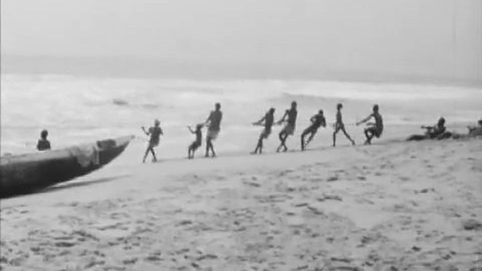 As the sound of metallic, rhythmically beating cowbells mingles with that of the recurrent rumbling, crashing surf, a single melodic voice rises with a call and a troupe of deep, buoyant tones responds in a harmonic chant. This is the traditional polyphonic sound system of a Ghanaian fishing community, filmed on a beach in 1964, sixty kilometres north east of Accra. The film shows a group of around thirty people as they work collectively to draw their ocean fishing net back to shore.1 As the cowbells ring and the mellifluous singing rises, the group marches slowly backward in step, tugging at a single rope that stretches out into the bay, bobbing up toward the sky and down again, giving a collective bounce to their gait. The men and boys are dressed in white shorts and fedora hats, most often with no shirts, like a singular body of sixty arms and sixty legs tethered by a single cord. As the film rolls, women wearing wrappers and dresses made of imported, printed fabric take hold of the line and lend their strength to the seaside tug of war.2 The final shots show the community members dividing up the catch; some fish will be eaten together and the rest will be sold at market.