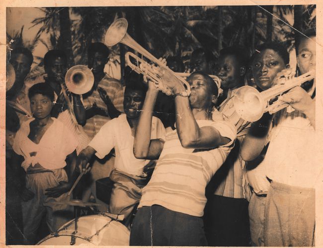 The film was made by the Seegers, a famous American family of folk musicians, during their ten-month world tour. To the unfamiliar viewer, the scene conveys an image of Ghanaian society as an exotic, almost premodern, tropical idyll. How much was staged is unclear, but what is clear is a culture in which sound and rhythm organize collective life: an intergenerational group using song to synchronize their work—a “sonic body.”1 The young adults in the group might have laboured on the beaches during the day and then, in the evenings, flocked to town centres, where they could dance to the rhythm of their work song relayed by young musicians with modern instruments. The beat became popularized as a sound called highlife, which rose to be Ghana’s preeminent artform by 1957, when the country became independent from British colonial rule. Highlife, as both music genre and lifestyle, was carefully orchestrated by Kwame Nkrumah, Ghana’s first Prime Minister, and his new government to manifest a culture that would appear exclusively African in origin—part of his mission to invent a national identity rooted in a vision of collectivity and modernity. In reality, the roots of highlife date back to early exchanges between Europeans and Africans in the urbanizing coastal centres of West Africa. The music reflected the region’s transition from a society based on subsistence farming and fishing to one in which lifestyles were conditioned by the architecture and infrastructures of modernity.2