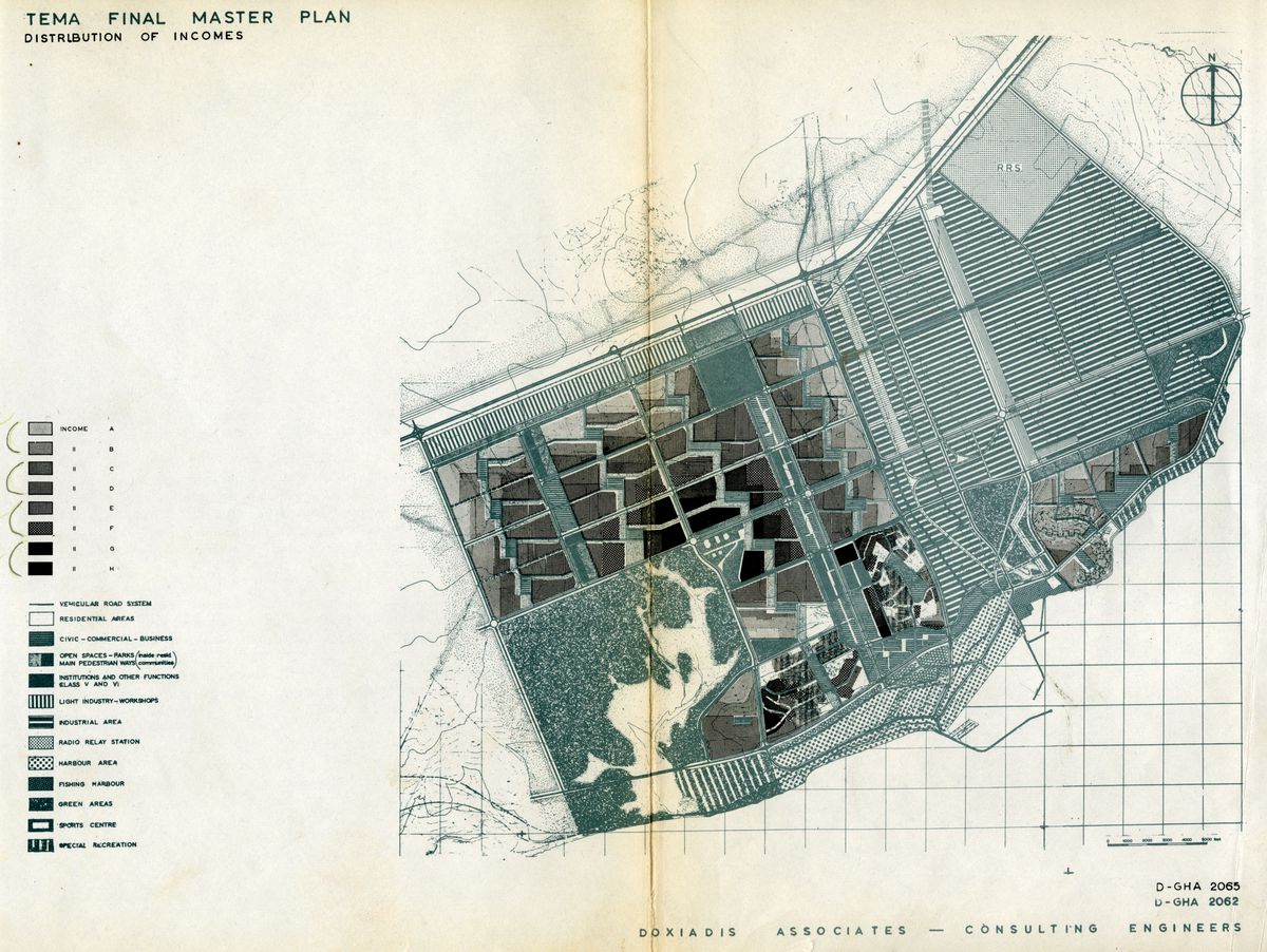 In parallel with the port development, Tema New Town was conceived of both to relocate the displaced fishing village and to create housing fit for a modern, independent African society. The masterplan was a demonstration of how a modernist urban model could be, in theory, imported into Africa by Europeans. The initial plans, developed by Alfred Alcock, Maxwell Fry, and Jane Drew, translated the English new town for the continent, resulting in the development known as Tema Manhean. In 1960 however, frustrated at the rate of progress, Nkrumah employed the Greek planner Constantinos Doxiadis to develop an even more efficient masterplan.1 The architecture archive of the Tema Harbour and New Town project therefore overwhelmingly privileges these European perspectives. Fry and Drew’s drawings and journals cover the initial design development during the late colonial period, while Doxiadis’s cover design strategies developed in the years after independence. Fry and Drew’s archives contain detailed accounts of their lives, relationships, and desires, but relatively little reflection on the views of the people they were designing for. Similarly, Doxiadis’s archives contain copious technical detail of the design strategy and progress, while only a brief sense of local perspectives can be gleaned from the strained correspondence with Nkrumah’s administration. Even though both firms referenced local typologies in their plans, the archive offers only a self-contained, almost singular historical view and presents a narrative of the conception of architecture as a linear exercise in fulfilling a design brief that, in this case, excluded the cultural complexities of the context that brought that architecture into being.2