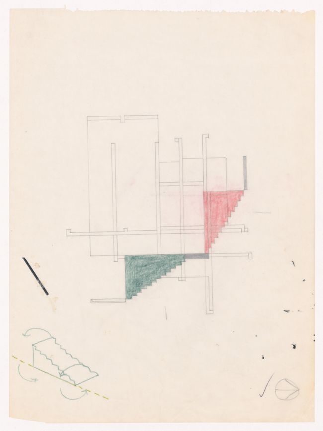 To expose the arbitrary nature of signification, Eisenman relied on the diagram to introduce what he called an “internal motivation” into the design of his early houses, employing generative diagrams that are purely self-referential and hence purely formal.3 In figure 1, Eisenman tries to determine the composition for vertical circulation in house VI (Cornwall, Connecticut, 1972-1975). An upside-down staircase rendered in red crystallizes the theoretical operation of conceptual architecture. Eisenman places it in contrast and opposition to the functional staircase rendered in green. The red upside-down staircase explicitly lacks a practical, and hence perceptual, purpose; it is a formal entity through which Eisenman “unmotivates” the architectural sign of the staircase, liberating its representation from signifying an act of vertical circulation. In such a case, he arrives at what architect and critic Silvio Cassarà terms a chronicle of an “unexpected” architecture—an architecture that is virtual in the sense that it embodies a memory of its past condition, projected as a formal trace of a deliberately misplaced and decontextualized idea.4