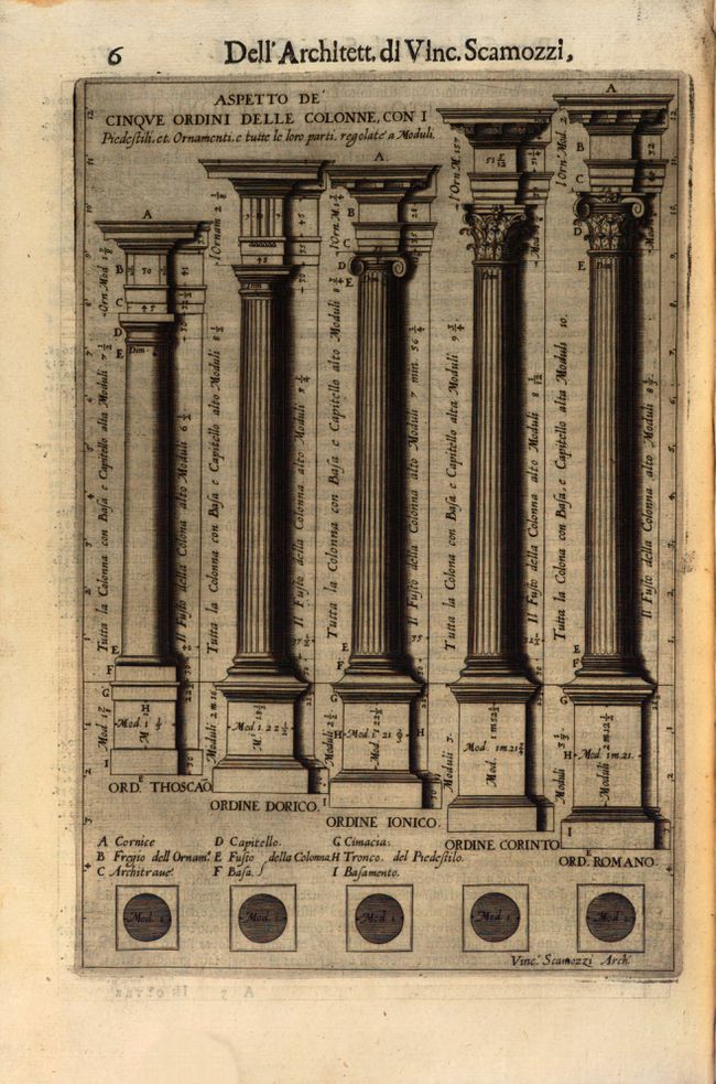 Vincenzo Scamozzi, L’idea dell’architettura universale…divisa in X libri, Lib. Sesto, Cap. II (Venice: Expensis auctoris, 1615), 4; translated in Vincenzo Scamozzi, Vincenzo Scamozzi, Venetian Architect: The Idea of a Universal Architecture, Book VI: The Architectural Orders and Their Application, trans. Patti Garvin, Koen Ottenheym, and Wolbert Vroom (Amsterdam: Architectura & Natura Press, 2008), 55. ↩
