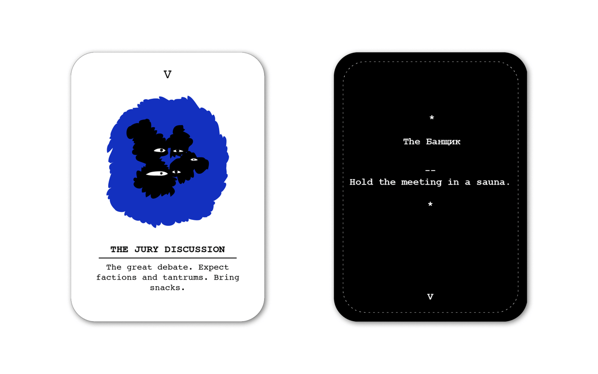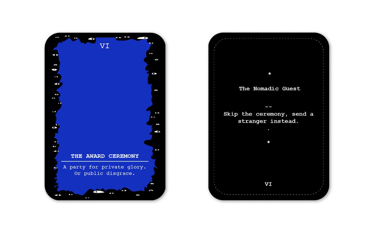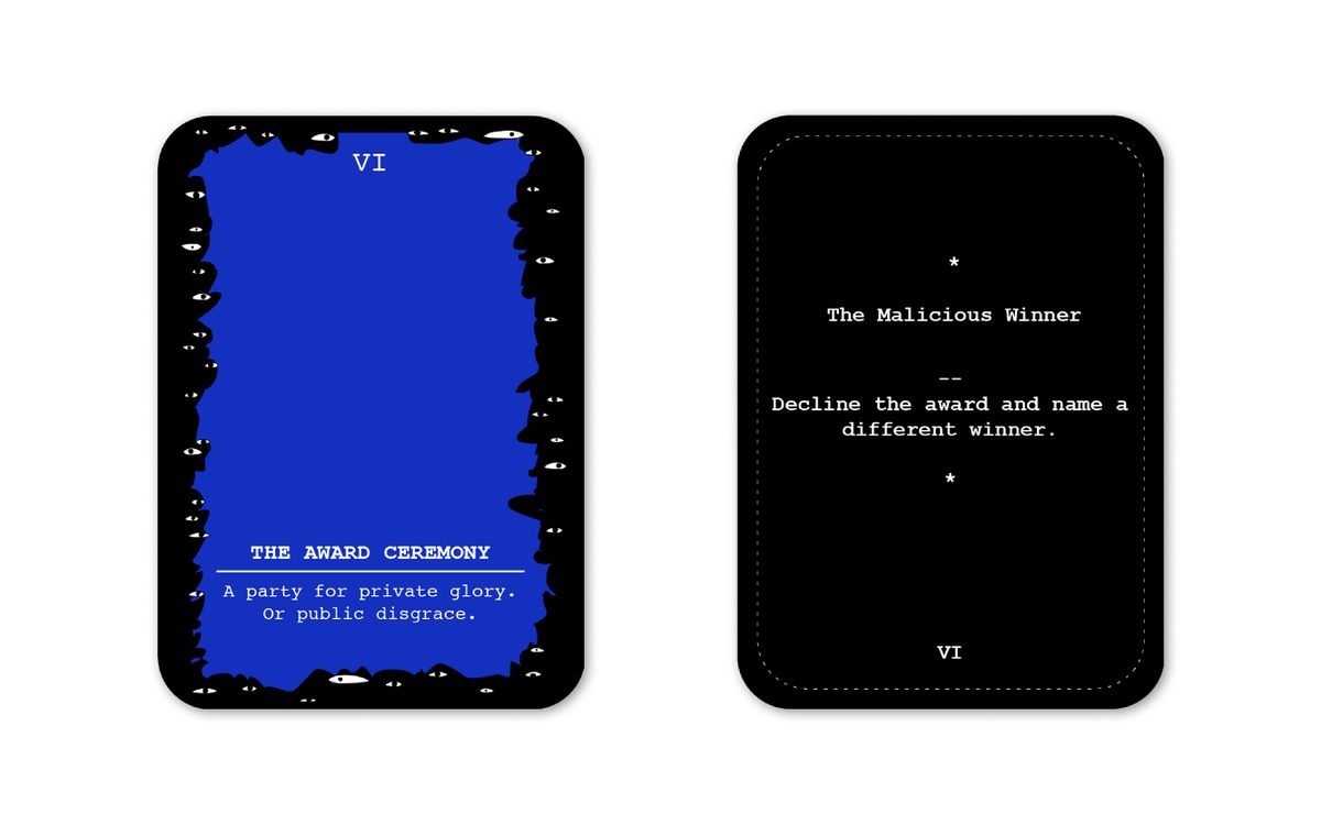 Our Joker cards may prompt new relations and interactions between you, the others, the award, the prestige, and the punishment, at each stage of the typical awards process. Changing roles can lead to greater awareness of the game’s mechanisms.