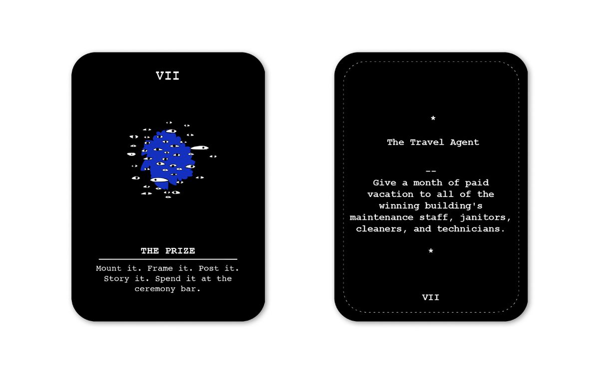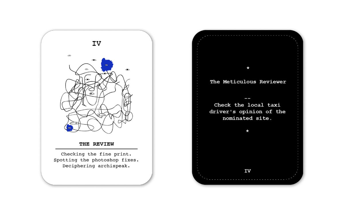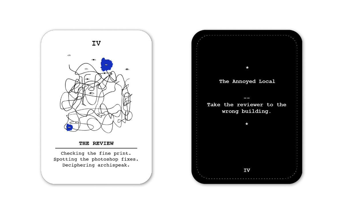 Warning: Use of the Joker cards can cause increased questioning of the predominant protocols of architecture awards. Play with lust and seek disturbance. The full set of 79 cards is available to print and cut-out or as a poster.