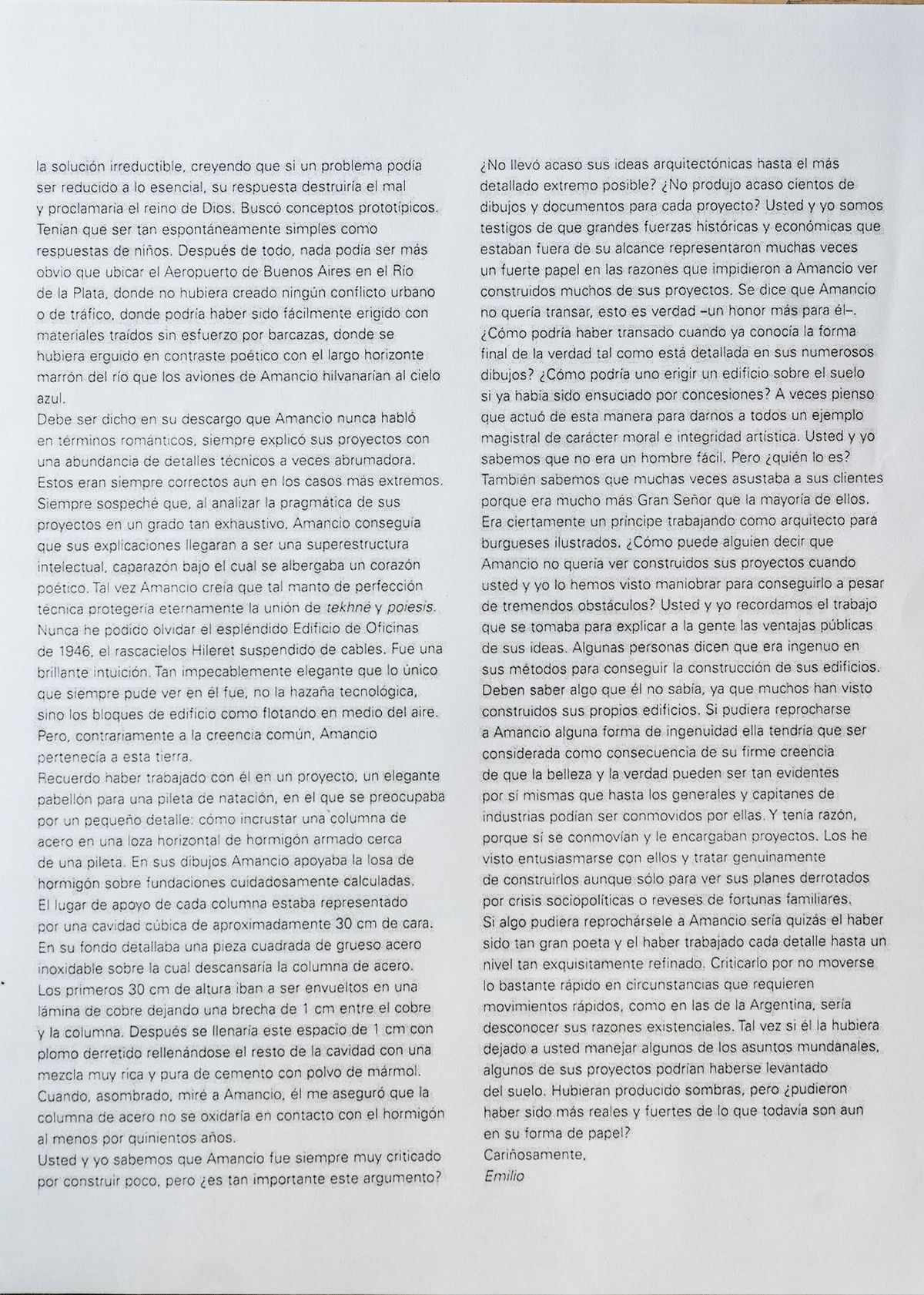 I have never been able to forget Amancio’s splendid tall office building of 1946, the “skyscraper” suspended from wires. It was a brilliant insight. So impeccably elegant that the only thing I could always see was not the technological bravado, but the blocks of buildings floating as if in mid-air. But, contrary to popular belief, Amancio was of this earth. I remember working with him on a project, an elegant pavilion, and he was concerned about a small detail: how a steel column would rest on and inside a horizontal reinforced concrete slab, close to a swimming pool. In his sketches, Amancio laid out the concrete slab on carefully based foundations. Then, the resting location of each column was represented by a cubic empty cavity, an approximately thirty-centimetre cube. At the bottom of the cubic cavity, he detailed a square piece of thick stainless steel plate, on which the I-beam steel column was to rest. Then, the first thirty centimetres of the steel column were to be wrapped in a copper sheeting, leaving a one-centimetre gap between the copper and the steel column. Afterwards, this one-centimetre interspace was to be filled with molten lead and the remainder of the cavity was to be again filled with a very rich and pure mixture of cement containing powdered marble. When, puzzled, I looked at him, Amancio assured me that this was done to ensure that the steel column wouldn’t rust in contact with the concrete for at least five hundred years. You and I know that Amancio has always been criticized for building very little, but is it such an important argument? Did he not carry his architectural ideas to the most detailed extent possible? Did he not produce hundreds of drawings and construction documents for each project? You and I are witnesses that larger historical and economic forces beyond his power many times played a very strong role in the reasons why Amancio did not get to see many of his projects built. It is said that Amancio did not want to compromise; that is true—more honour to him for that. How could he have compromised when he already knew the ultimate shape of truth as detailed in his many drawings? How could one put a building above ground if it had been soiled by compromise? I sometimes felt that he did it to give us all a master example of moral character and artistic integrity. You and I also know that he was not an easy man —but then who is? We also know that he frightened his clients many times for he was more of a Grand Lord than many of them. He was certainly a Prince working as an architect for enlightened Burghers. How can one say that Amancio didn’t want to see his projects built when you and I have seen Amancio maneuvering to get his buildings built in spite of tremendous odds? You and I remember all of Amancio’s travails to explain to people the public advantages of his ideas. Some people say that Amancio was naive in his methods to get his buildings built. They must know something he did not know, for many of them have seen their buildings built. But, if Amancio can be blamed for any form of naivete, it would have to be placed at the feet of his steadfast belief that beauty and truth can be so self-evident that even Generals and Captains of industry would be touched by it. And he was right because they were touched by it, and they commissioned him projects, and I have seen them touched by them and genuinely trying to build them only to see their plans defeated by socio-political crises or disturbing reversals of family fortunes. If blame can be put on Amancio for anything, it would be for being such a great poet, for working out each detail to such an exquisitely refined level. To blame him for not moving fast enough in circumstances like Argentina’s that required nimble dancing would miss his existential reasons. Perhaps, if he had let you handle some of the worldly affairs, a few of his projects might have gotten off the ground. They would have cast shadows, but would they have been any more real and stronger than they are still today, even in their paper form?