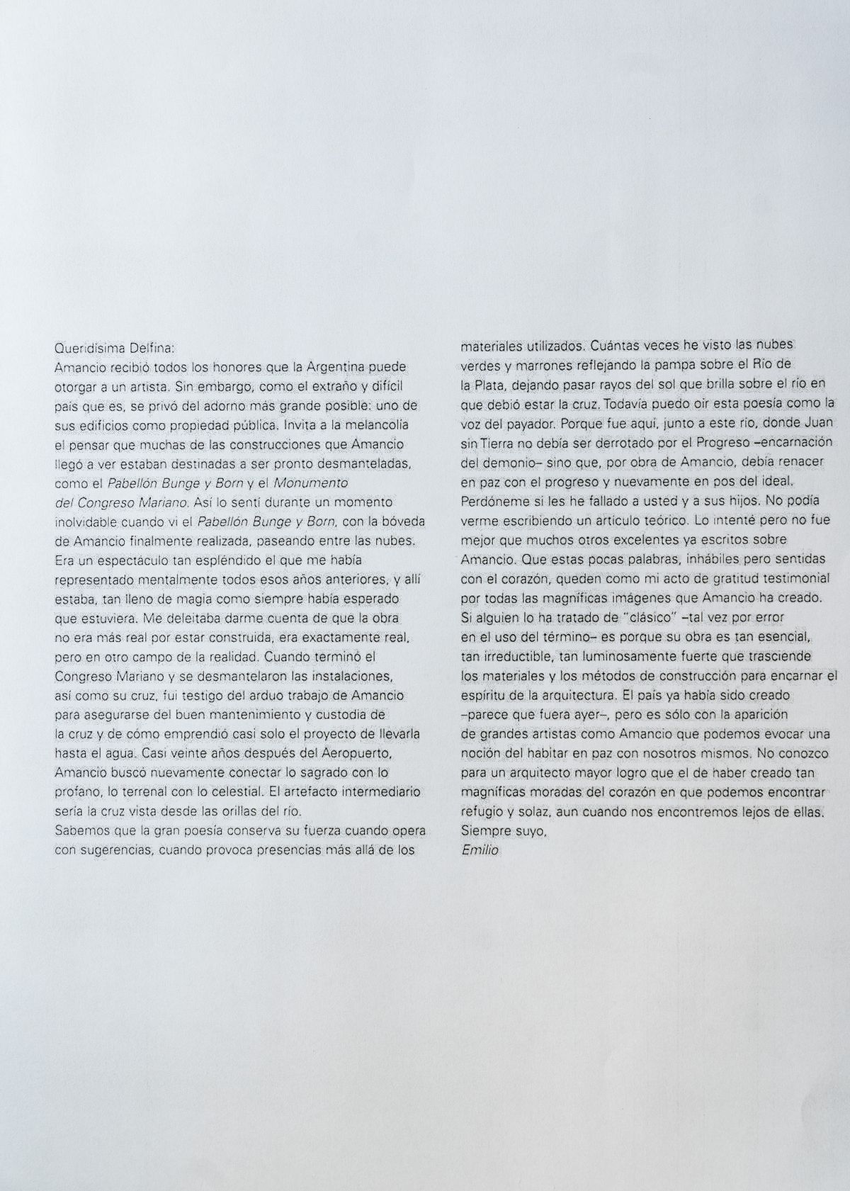 Amancio was always fascinated, or, should I rather say, bewitched, by the pursuit of escaping earth’s gravity. First, as a young man in the late 1930s, when he was an aviator; and then when he started inventing architectural prototypes as flowers linked to the earth by the thinnest stems—their roots in memories and their bodies high above the ground. This archetypical pursuit might to some superficially resemble that of Le Corbusier’s, but Europe’s land had been scarred by the march of history and lifting the building above was Le Corbusier’s only way to establish a new datum. Amancio’s land was pure and man had to ask permission to set foot on it. To hover high above the ground was the respectful thing to do; to let the land and building remain true to themselves, uncorrupted by context. I know you must be thinking that this note is unscholarly and embarrassingly too personal; and SO it IS; you are right. However, having tried to write this so many times, I feel that this is my most faithful and loving way to do it. I’ll write to you again soon.