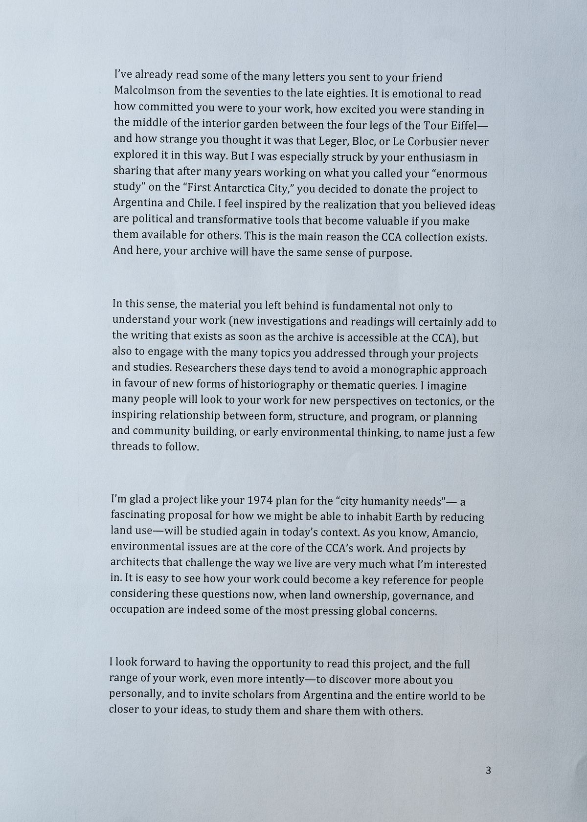 I’ve already read some of the many letters you sent to your friend Malcolmson from the seventies to the late eighties. It is emotional to read how committed you were to your work, how excited you were standing in the middle of the interior garden between the four legs of the Tour Eiffel—and how strange you thought it was that Leger, Bloc, or Le Corbusier never explored it in this way. But I was especially struck by your enthusiasm in sharing that after many years working on what you called your “enormous study” on the “First Antarctica City,” you decided to donate the project to Argentina and Chile. I feel inspired by the realization that you believed ideas are political and transformative tools that become valuable if you make them available for others. This is the main reason the CCA collection exists. And here, your archive will have the same sense of purpose.