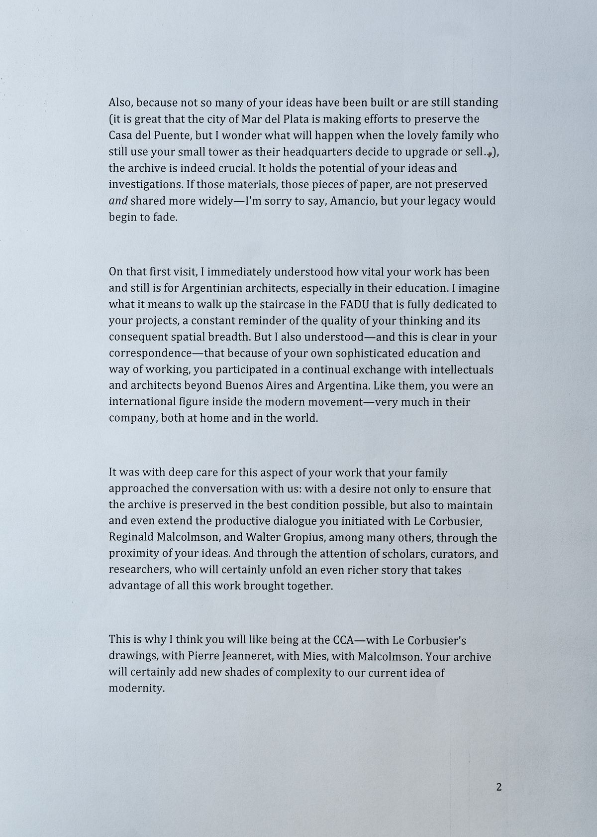On that first visit, I immediately understood how vital your work has been and still is for Argentinian architects, especially in their education. I imagine what it means to walk up the staircase in the FADU that is fully dedicated to your projects, a constant reminder of the quality of your thinking and its consequent spatial breadth. But I also understood—and this is clear in your correspondence—that because of your own sophisticated education and way of working, you participated in a continual exchange with intellectuals and architects beyond Buenos Aires and Argentina. Like them, you were an international figure inside the modern movement—very much in their company, both at home and in the world.