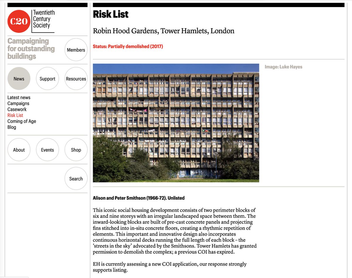 The Robin Hood Gardens continued to appear on the “Risk List” until 2017. For more information see https://c20society.org.uk/buildings-at-risk/robin-hood-gardens-tower-hamlets-london ↩