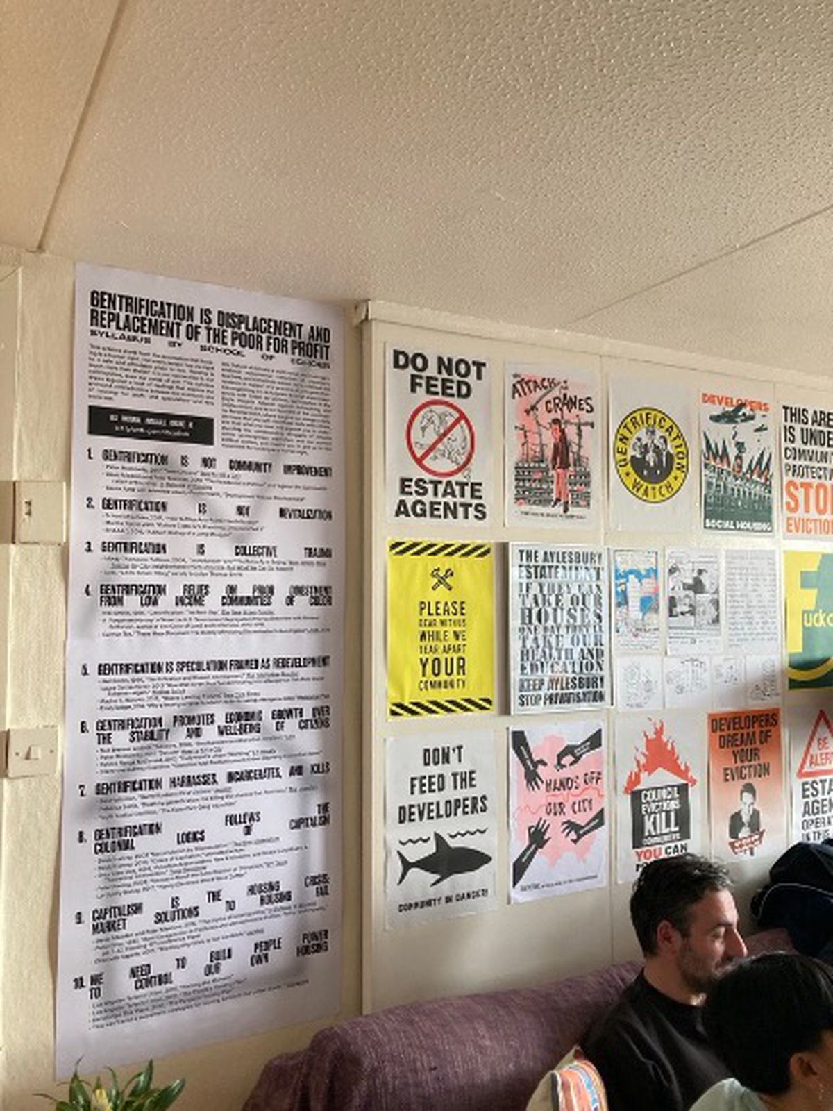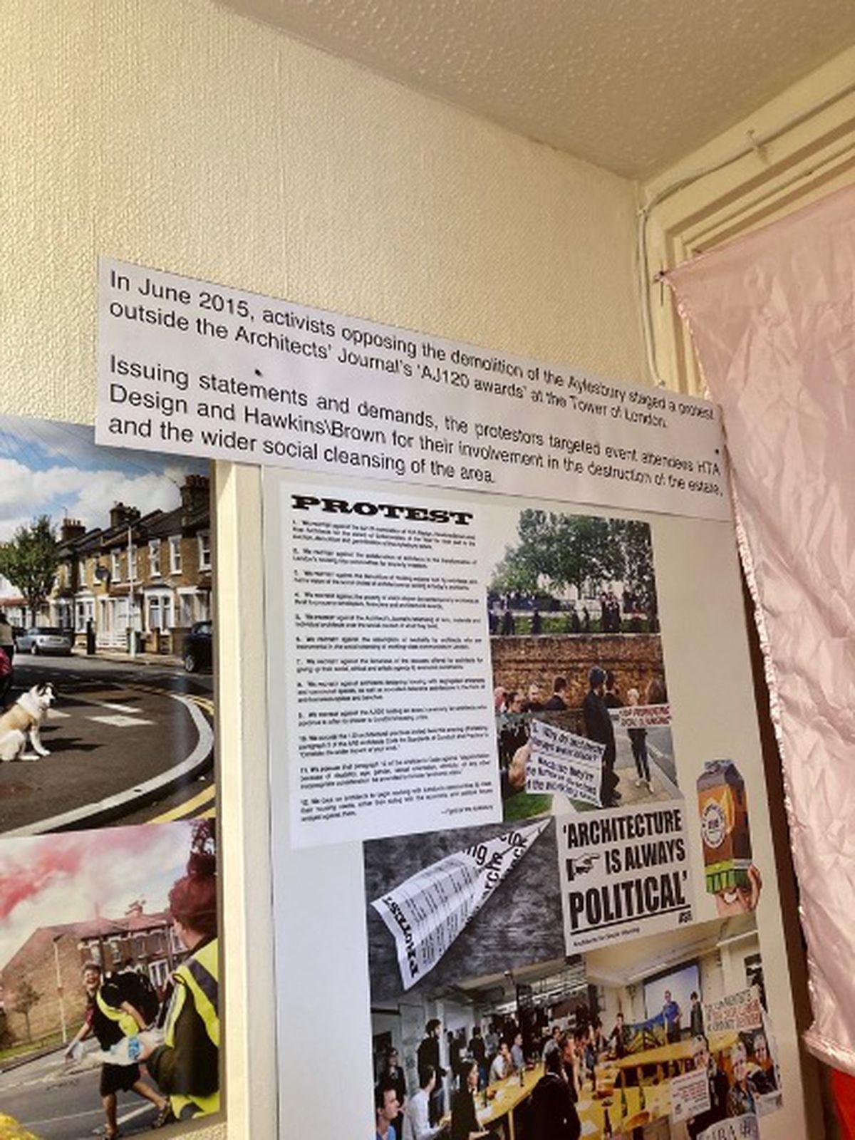 In decade-spanning processes of estate demolition and gentrification, communities of social housing tenants have organised in favour of renovation and have developed new community archivistic practices. Aylesbury Estate in Walworth, South East London, designed by Hans Peter “Felix” Trenton, was built in the same period as Robin Hood Gardens, with construction completing in 1977. In April 2023, an exhibition retracing the struggle against the ongoing demolition of the estate was held in the flat of a long-term tenant, Aysen Dennis. Each room of the flat told a story of resistance through numerous artefacts. This exhibition was the culmination of a documented process of dispossession, and a way to express a community’s right to their neighbourhood and city.