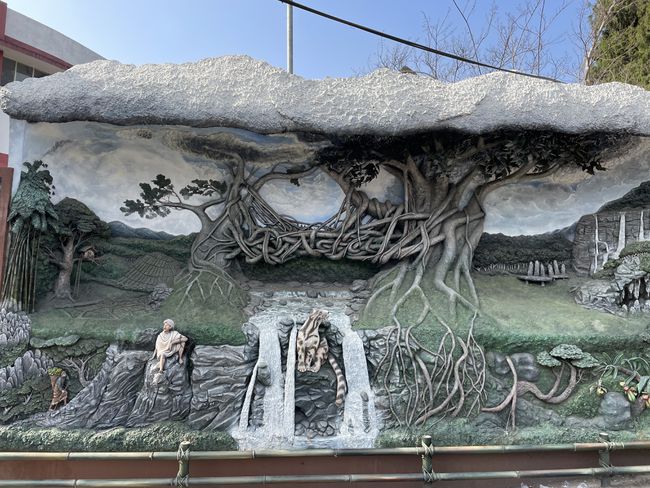 Over the last decade or two, Jiengking Jri have gained public and state recognition. They were recently submitted by the state of Meghalaya for a UNESCO Intangible Cultural Heritage status. In Shillong, Meghalaya’s hilly capital, there is a plaque of the Jiengking Jri outside the state archives and a mural opposite the High Court building, each depicting the bridges in a thriving ecology of forests, tigers, Khasis, and other living beings—a tableau vivant of kinship, sustainability, and multispecies relations. This recognition for Khasis, has also threatened local ecologies; the cunning, or duality of recognition that both Aparajita Majumdar and Frederick express differently.1 Tyrna is home to the Rittymen root bridge—the longest in the world—and the Nongriat double decker root bridge, which is more than 150 years old and the iconic emblem of Meghalaya. While Rittymen is accompanied by signs or requests from local villagers not to walk across it in groups to avoid its collapse, at Nongriat Khasis have placed wooden planks on the bridge to sheath the ever-growing young roots.