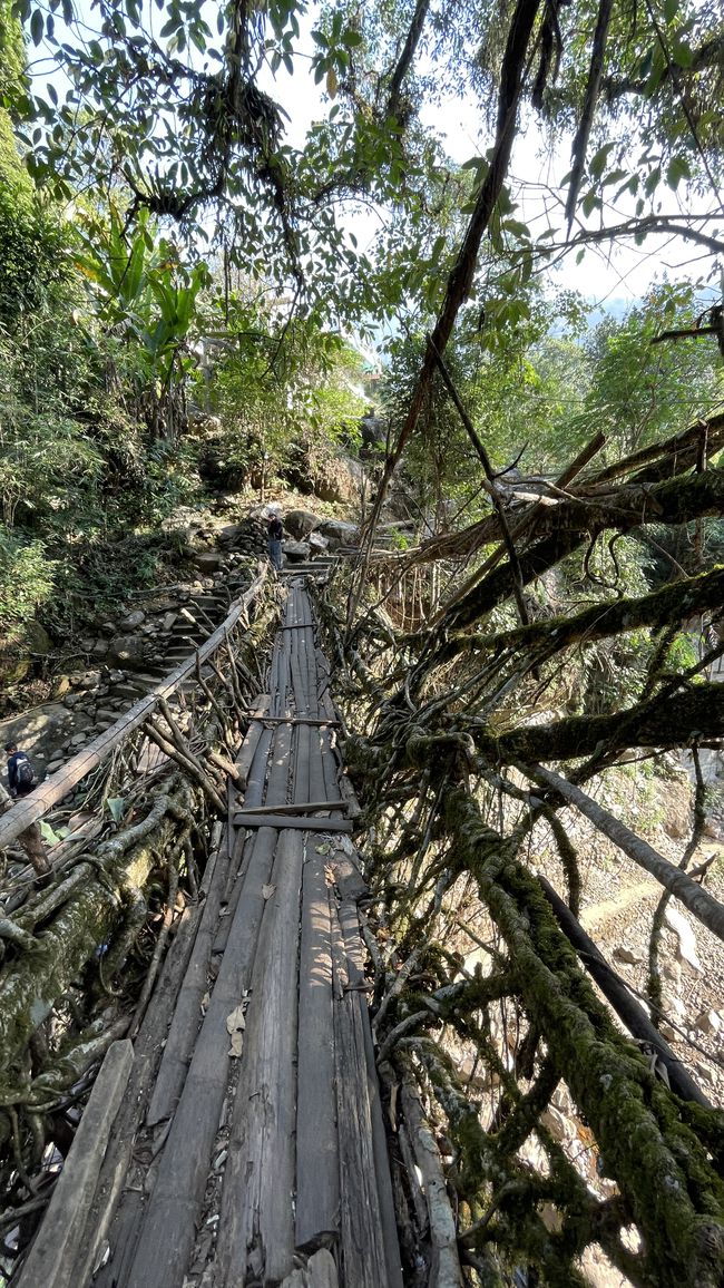 Building the root bridges fundamentally means contending with the hilly terrain. One has to trek up and down thousands of steps along a steep hillside. Hamlets are perched higher on the ridges, and the root bridges are always at the foothill of gorges—where it is usually flat enough for the tree to take root and for Khasis to find and carry synsar or siej poles on the riverbanks. Khasis build bridges in close relation with vegetal time—allowing plants to mature thirty or forty years before they can be walked upon as functional bridges. Each bridge thrives for a century or longer.