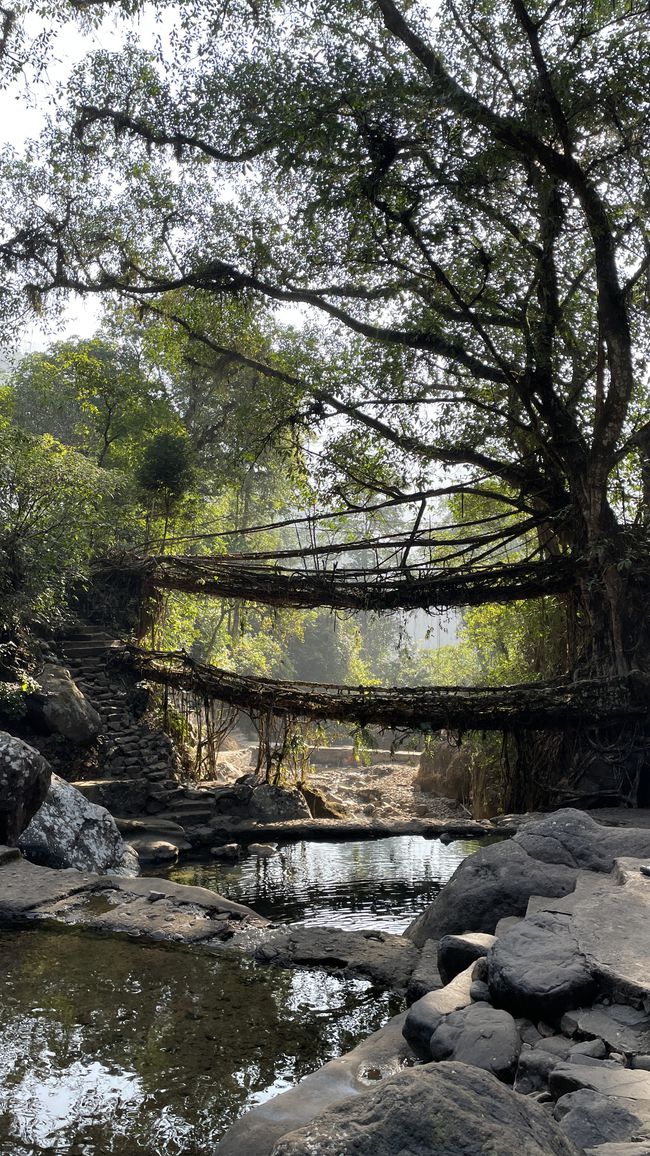 Khasi refusal or distance from the state manifests in many forms, some laced with humour. My Khasi friends and interlocutors tell me how modern steel bridges in the area, designed by civil engineers, have either collapsed, thanks to boulders or rocks flowing with the force of the stream, or rusted away in Meghalaya’s extreme humidity. On the other hand, Khasis built their living root bridges by placing them at a slight oblique angle to the stream, at bends and curves along the riverbanks to prevent the direct impact of boulders. And they were made with living roots that thrive instead of collapsing in the rain. Khasis are often amused by the state’s efforts to build bridges in the area—a mild disdain towards modern civil infrastructure. At the Mawsaw bridge, Khasis have extended roots from the adjacent Jri Bramon trees and woven them around an existing steel bridge—an attempt at recuperating a bridge that they consider as the state’s presence in the hills. While the Mawsaw bridge is closed to visitors for now, I saw how tree roots have been tucked in, woven around, and made to fill the gaps on the steel bridge. One day, this rusty steel scaffolding will chip away and the three Jri Bramon trees that envelope it will hold the bridge and those who cross over it.