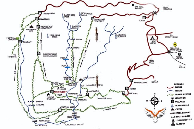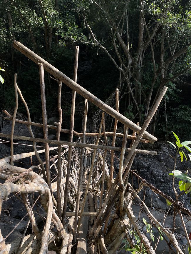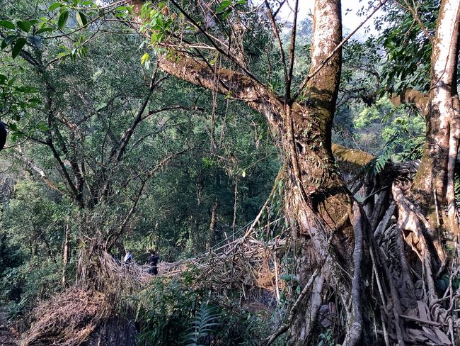 Beyond binaries of harm and violence, economies and their opportunity costs, I also realize recognition disavows how local Khasi residents recollect building Jingkieng Jri. As the Khasi community moved deeper and deeper into the hills because of war, these vegetal infrastructures provided the means to cross the riverine and forested terrain. According to the oral history and genealogical recollection around Tyrna, the region came into being because of war between neighbouring villages Mawphu and Nongriat, and the larger resistance to the Sohra kingdoms. Mawphu villagers sent over bulls to plunder Nongriat, whose residents killed and ate these bulls. However, the bulls had been poisoned by Mawphu residents and the Nogriat villagers died as a result, except for one family that refused to eat the bull meat and survived, eventually spreading their clan across the Tyrna area. Fugitivity, war, and seeking refuge in the forest undergirds a local historical understanding of why they came to build root bridges in the first place, and such fugitive conditions have produced multispecies relations with the Jri Bramon tree. Contemporary state recognition thus colonizes the community’s political agency—preying and prying on their worlds by making them icons of multispecies and sustainable living—while obfuscating the political and historical conditions of refuge and refusal in the forest through which these worlds are built.