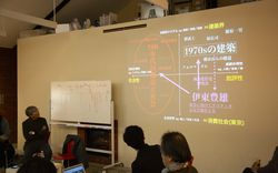 As he referred to his timeline, Hara spoke freely of interrogations and critiques of modernity, ranging from criticisms of dialectic thinking and skepticism about electoral democracy and money to reflections upon the similarities and differences between Adorno’s negative dialectic and Buddhist or Japanese thought. While we wanted to explore were the origins of the imposition of postmodernist architecture upon Hara’s work, postmodernist architecture appeared to be a topic outside his sphere of interest. The focus of his thought regarding the modern era never deviated from a critique of “homogeneous space” and the question of how to surmount it.