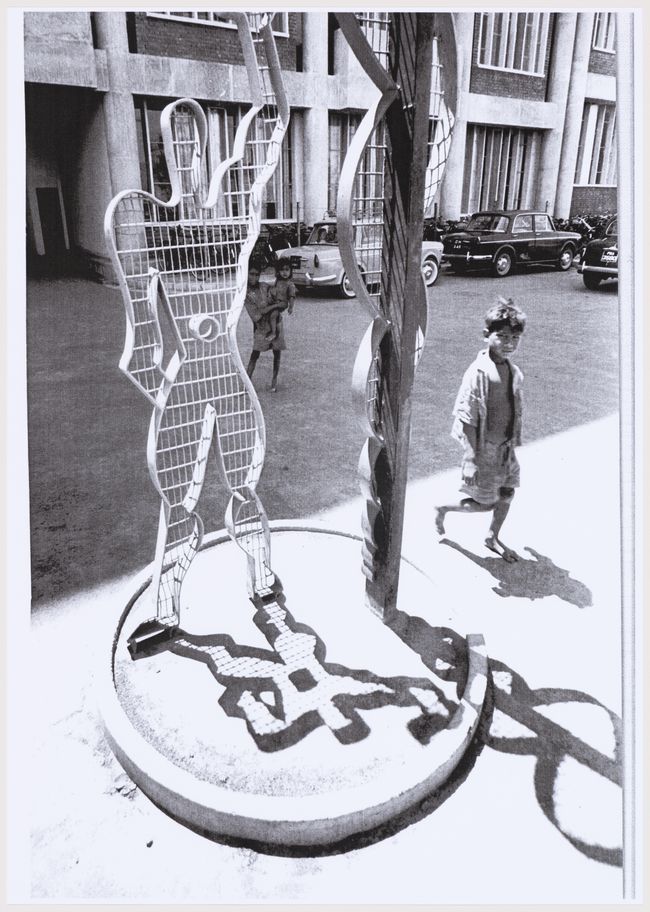 Unknown photographer, street with Modulor Man sculpture in Chandigarh, India, 1950-1970. Gelatin silver print, 29.6 x 21 cm. ARCH279613, Pierre Jeanneret fonds, CCA Collection. Gift of Jacqueline Jeanneret.
