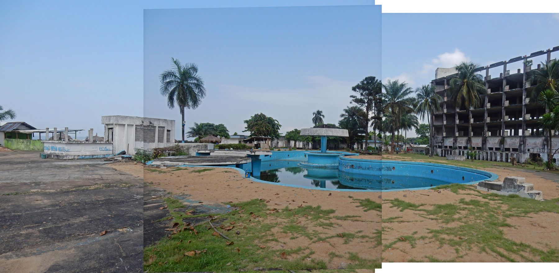 Between the pool and the hotel were the derelict metal frames of two modular military hangars left behind by UNMIL. From where I stood, I saw bodies crumbling into other bodies: the remnants of a former modernist beach resort with its pool, disco club, and casino all in ruin, the skeletal frames of the modular military structures, and fragments of canvas bearing the UN logo. The ferocity of the damage inflicted on the hotel building and the tenuous skeletons of the UN modules stood together in deafening silence as reminders of tragic failure, a collapse of collective hope, national dreams, and modernity itself.