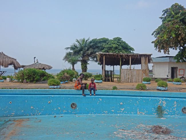 As I walked along the remains of the pool, a security guard who had enthusiastically accompanied us pointed out the former hotel. Next to it stood a woman holding a baby and watching us with a timid smile. Kids were running around. The guards, it seemed, lived with their families in the ruins of the hotel.