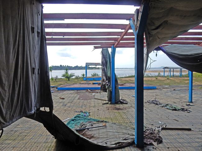 The hosts had good memories of outdoor gatherings, enjoying the backdrop of the ocean and the river, and were elated to see that a wooden deck the UN troops had installed along the riverbanks was still partially intact. For us, the deck was a ruin, a vacant remnant of the UN’s presence. The big cabana looked like the last spot the UN had evacuated, as if they had left in a rush. There were large sheets of plastic hanging from a temporary wall, pieces of outdoor rubber flooring, and UN food packaging scattered around.