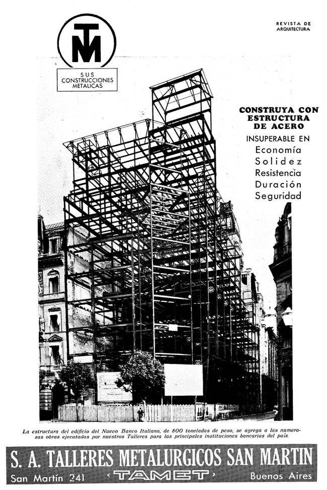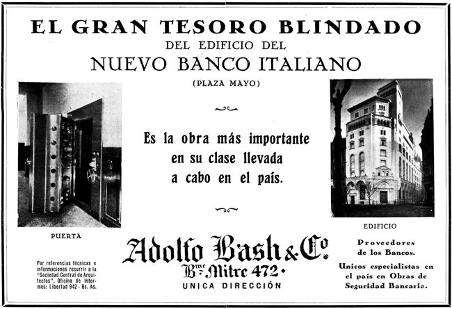 The basement of the Banco El Hogar Argentino building guards much capital and safety deposit boxes for the public. Built entirely in reinforced concrete—using the latest technological requirements of the time to ensure its safety—it offers the most complete defence against robberies and hold-ups.