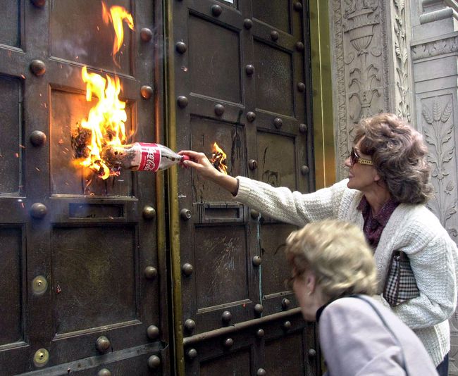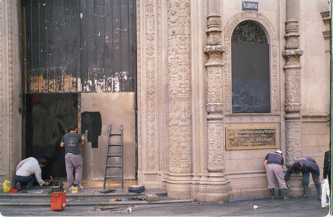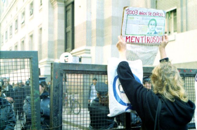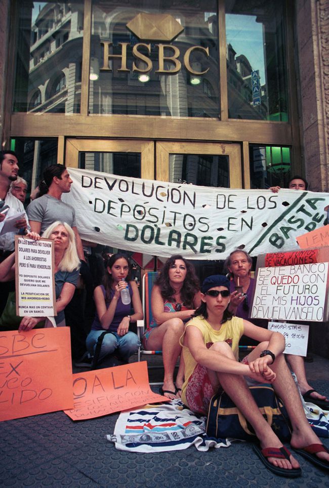 “We deposited dollars, we want our dollars,” is the message repeatedly found on protest signs in front of the First National Bank of Boston’s corner entrance, which is coated in Uruguayan marbles and bronze ironworks. The slogans refer to then-president Eduardo Duhalde’s pronouncement from his Inauguration Day: “Whoever has deposited dollars, will receive dollars.”