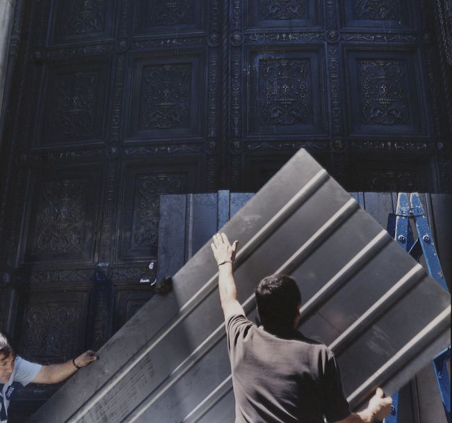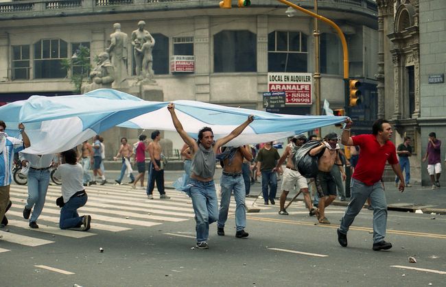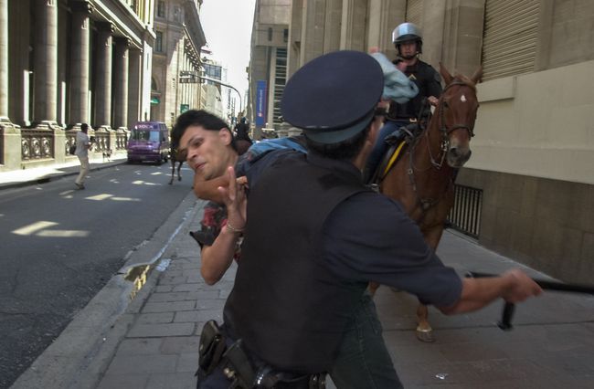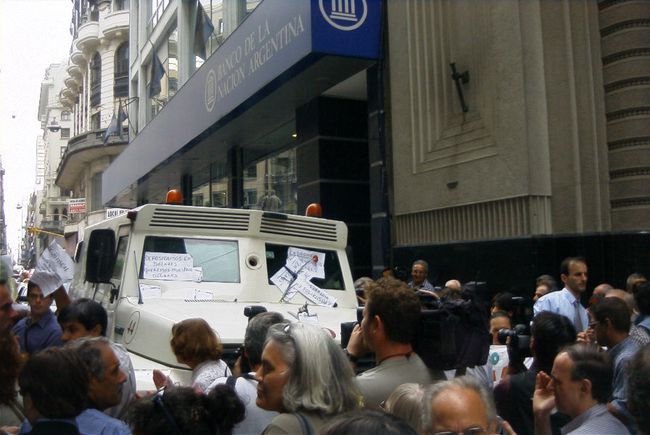 On the extensive side facade of the Banco Nación building with its Paris stone cladding, the dark colours of the pedestrian area stand out. A woman raised over a police fence a poster with the face of President Eduardo Duhalde posted on a 100 Argentinian peso bill.