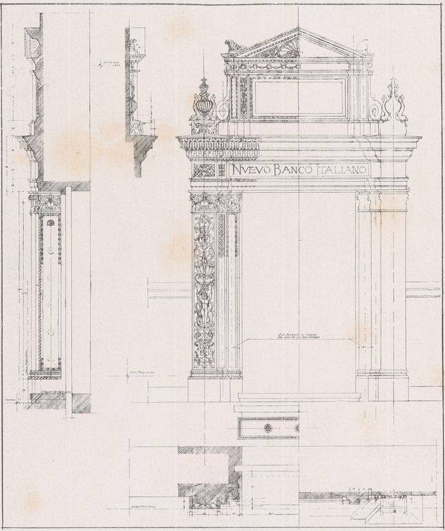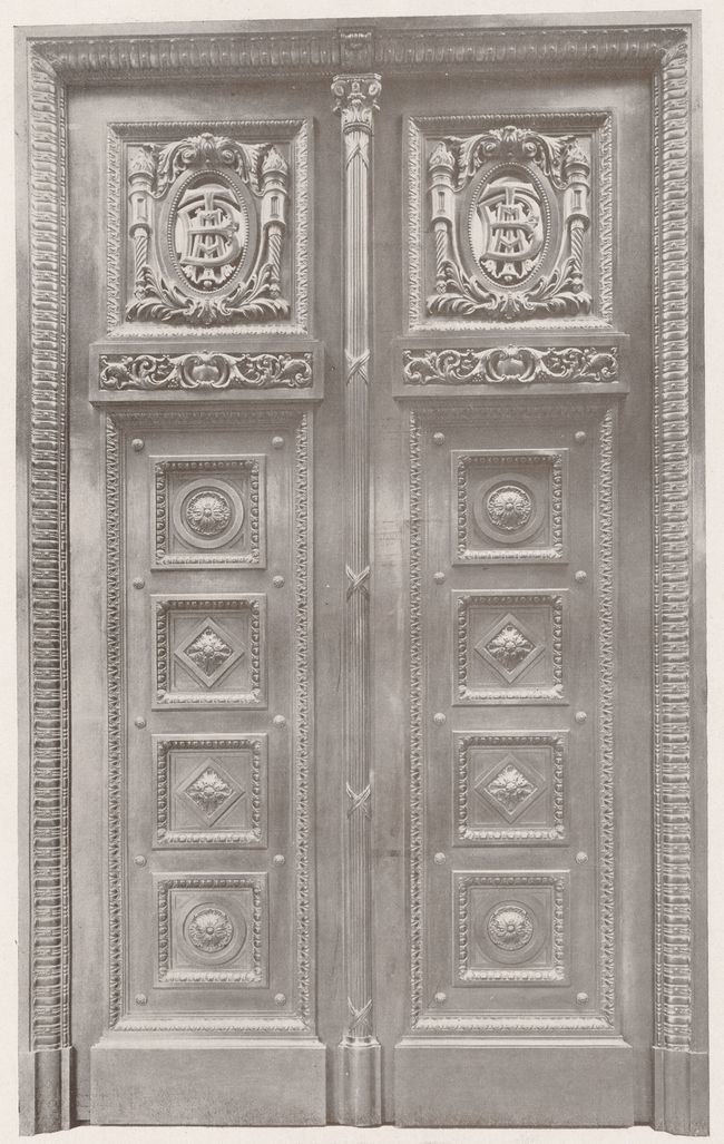 The sculptures and decorative details on the front elevation of the Nuevo Banco Italiano building are constructed in reconstituted stone from plaster models. The entrance door is the work of Campi and Novara, renowned for their competence and artistic prestige.