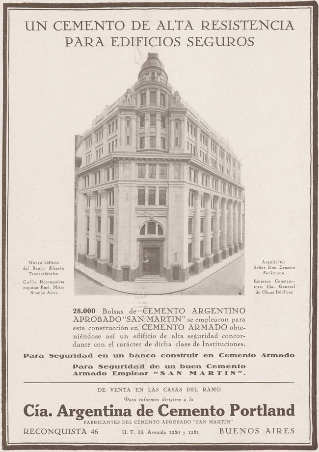 The cement used in the new Banco Alemán Transatlántico building is of high quality: 28,000 bags for the construction of reinforced concrete and 1,500 bags of white cement were used for the front of the building, for the sculptures, and for the interior stucco. This confirms the magnitude and efficiency achieved by the national industry.