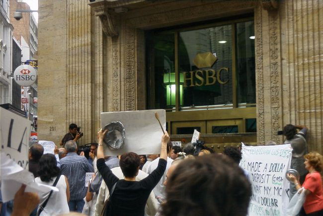 A group of people protest in front of the entrance door of the HSBC building (former Banco Popular Argentino). The large bronze gate, designed to shield access, is motorized and slides on recessed rails located between the glass front and the travertine exterior coating.