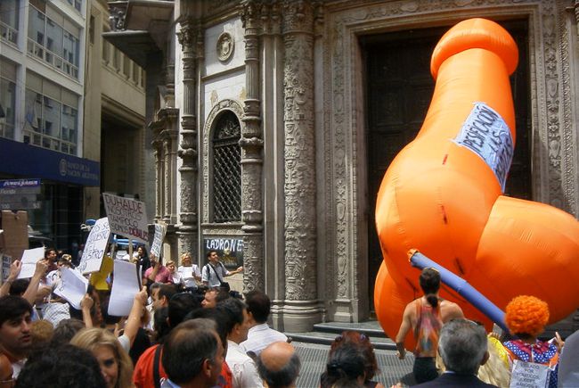 In front of the large main entrance of the First National Bank of Boston building, people of all ages gather to claim their savings. The pilaster carved in calcareous blocks divides the image in two. On the left, Calle Bartolomé Mitre and its building facades, rising behind protest signs that appear over protesters’ heads; on the right, a large phallic inflatable covers and hides the imposing four-ton bronze door.