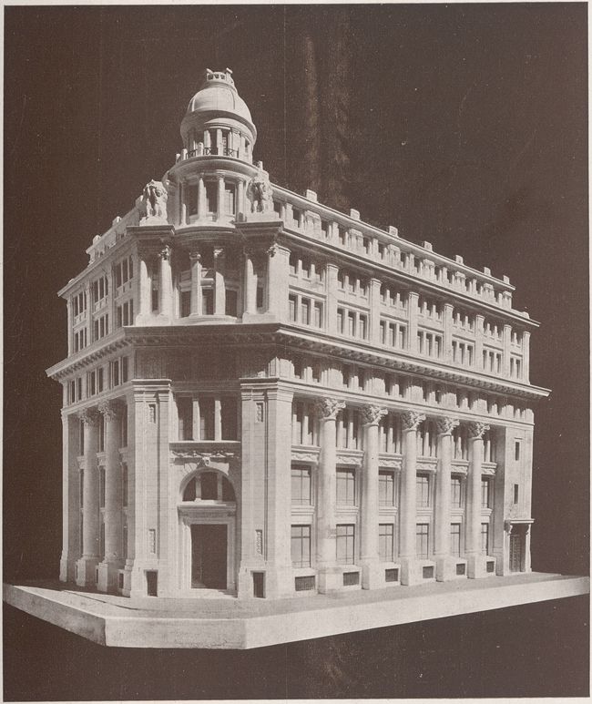 A carved wooden model of the Banco Alemán Transatlántico building shows the composition of the main facades and the relationship between the sandstone-clad pilasters and the bronze door located at the corner of the building.