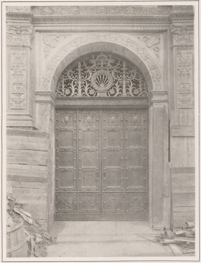 The side door of the First National Bank of Boston building, inspired by the Spanish Renaissance, adopts the general lines of the Hospital de Santa Cruz’s door in Toledo, Spain, and incorporates, under provisional wooden slats, fine ornaments and plateresque details.