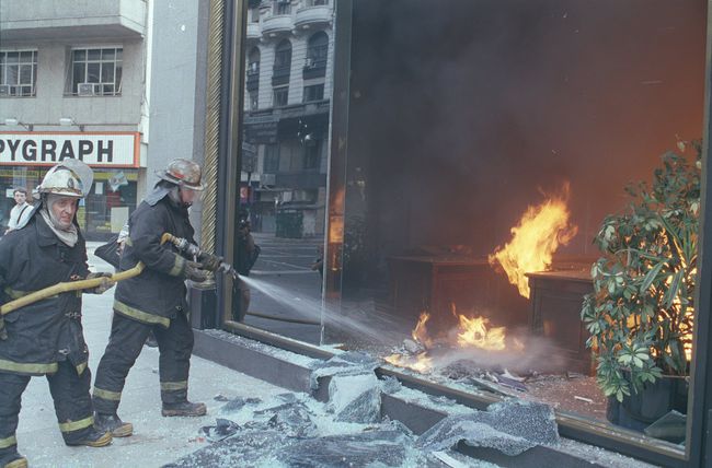 A single glass panel remained at the corner of Avenida Diagonal Norte and Calle Bartolomé Mitre, reflecting the neighbouring Bencich building. Broken glass and thick smoke cover the interior of Comafi Bank, while firefighters—from the sidewalk—point their hose to the burning flames.