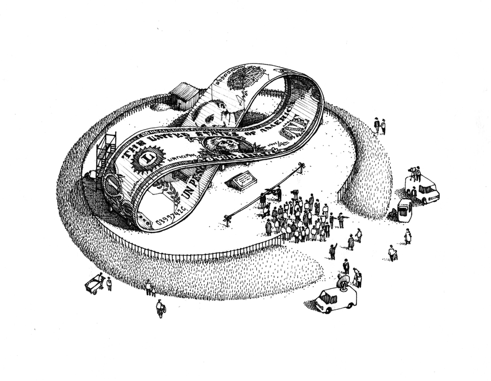 Although it has felt like a long time, the tumultuous relationship between the Argentinian currency and the US dollar only took shape over the last fifty years, extending its influence beyond the financial world to flood various aspects of daily life. The 1990s provided a framework for testing a magical solution called “convertibility,” a policy under which politics, the economy, and society came together to revere an inexplicable parity between the dollar and the peso which temporarily seemed to reassure many. Illustration © Manuel Ignacio Nesta
