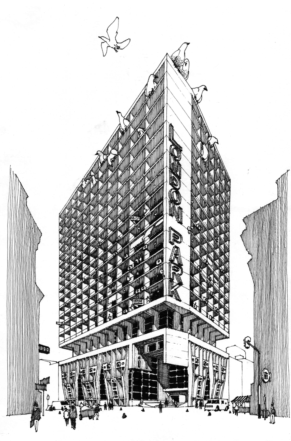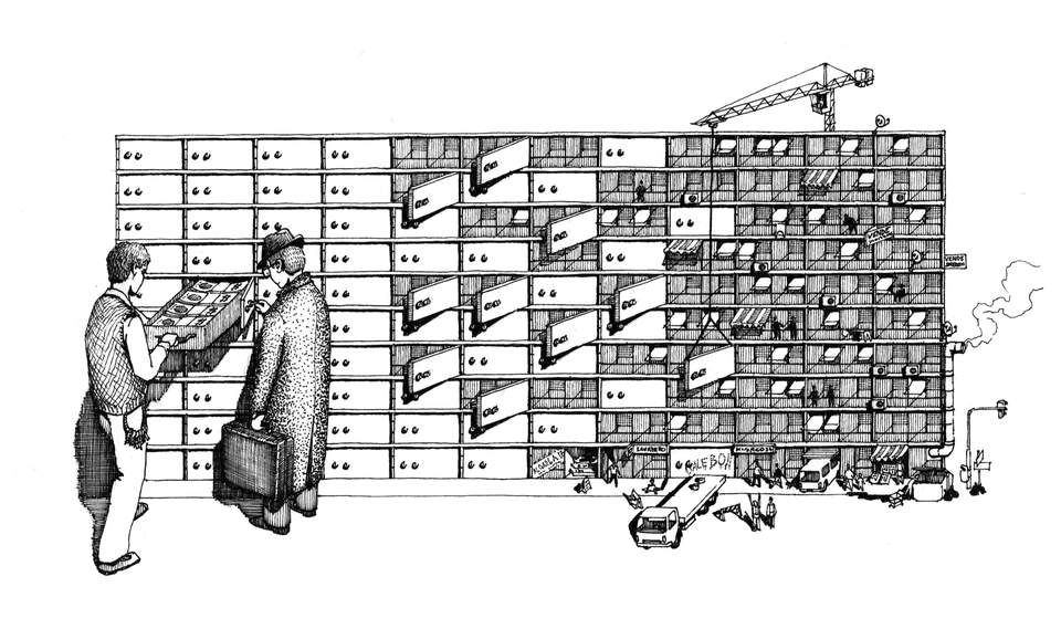 The one-room apartment, a living unit that meets minimum requirements established by the building code, has become the typology that guarantees the greatest amount of mobility in a market of moderate resources. In the collective unconscious, residential buildings now provide a sense of security in saving that was previously offered by the banking system. Architecture leaves its poetic commitment to the service of human habitat to serve money instead. As a result, housing has become a deregulated commodity accessible to a small circle of people. Illustration © Manuel Ignacio Nesta