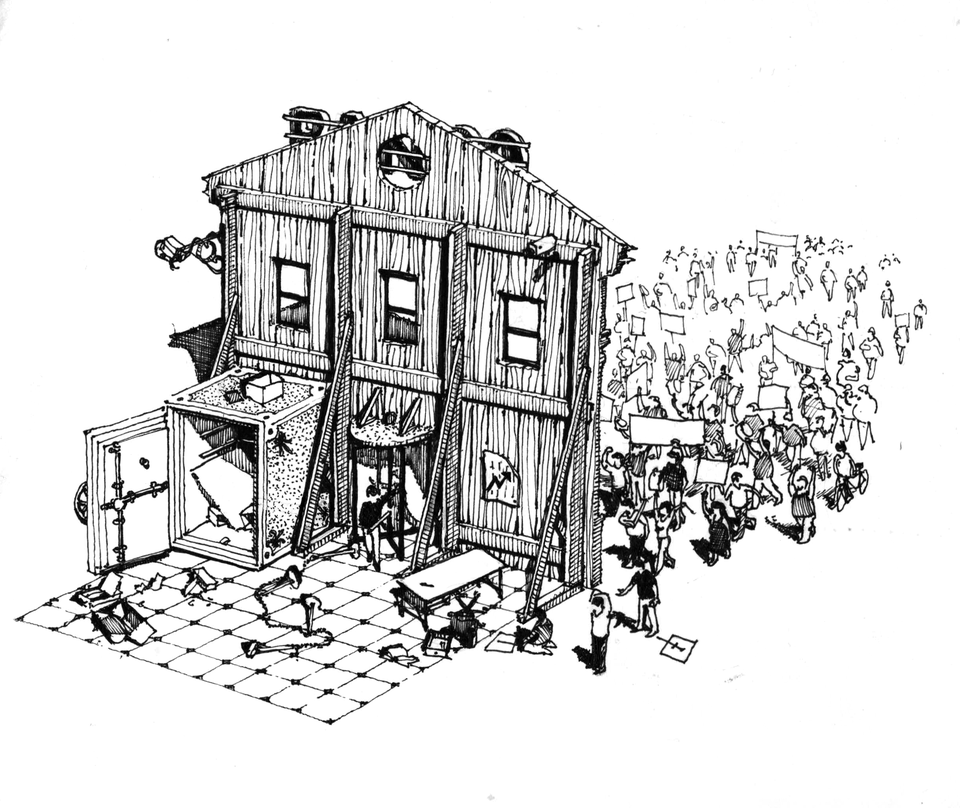 The inevitable and drastic devaluation of the peso brought an end to convertibility and pushed depositors to literally run to the banks to try and rescue their savings. In response, the banks closed their doors to those whose assets they had promised to house. The contrast between the historicist facades and their impenetrable status denotes the abrupt end of a relationship that took almost a century to forge. Illustration © Manuel Ignacio Nesta
