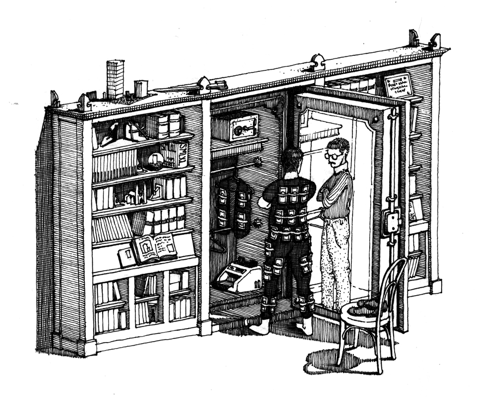 The slim guy, meanwhile, keeps going in and out of the Cave within the Cave. Every time he goes out, he leaves on the desk timely bundles of dollars, whose value, well preserved throughout these years, is ready to be transformed into physical matter. Finally, when no peso is left to be exchanged, he is handed all the bundles of money together with a small paper torn from one of those old accounting firm calculators that print yellowish receipts.