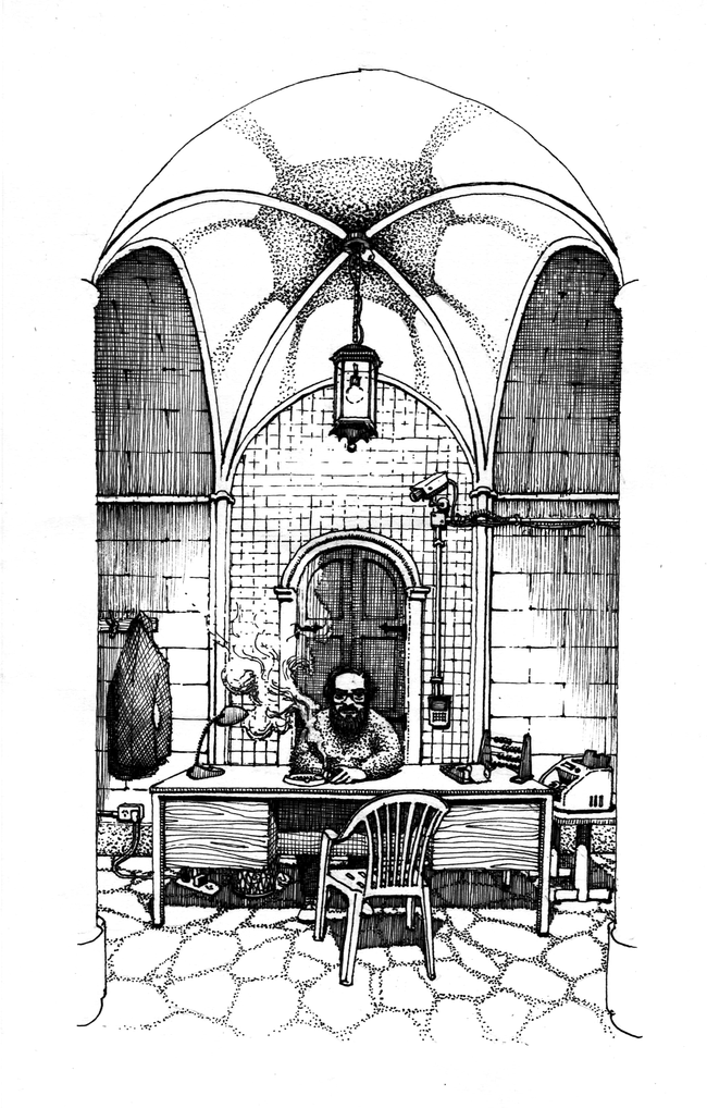 Arriving calms him and even encourages him, but another professional reflex makes him distrustful of the plain, mediocre hall. Following the anxiety he had to endure to get there, the place is disappointing. The mention of a cueva, or cave, always made him think of baroque and mannerist grottos, entrances to secret gardens, cabinets of curiosities, and places that border the transcendental. And this entry, almost devoid of any architectural language, decorated only with take-away rotisserie menus pinned by a diligent cadet, reinforces the feeling of a slow but inevitable immersion in a dark fluid, far from light and knowledge.
