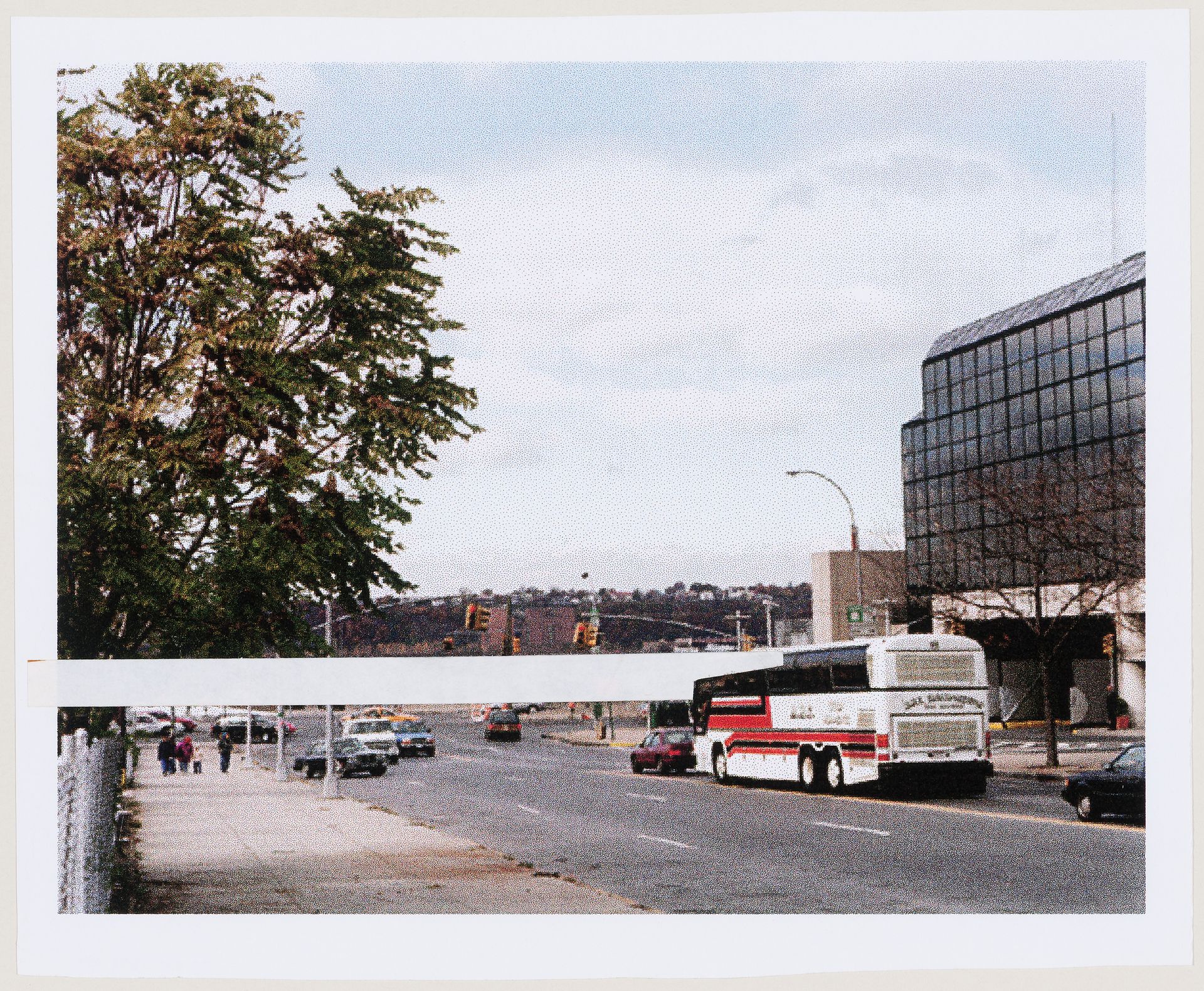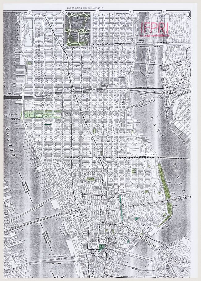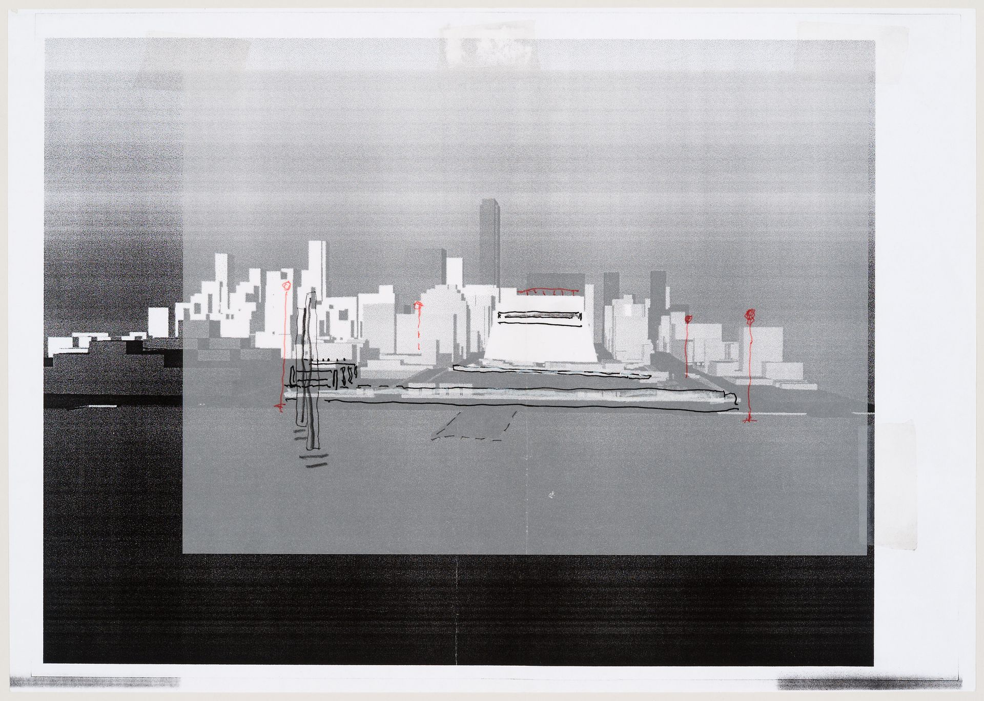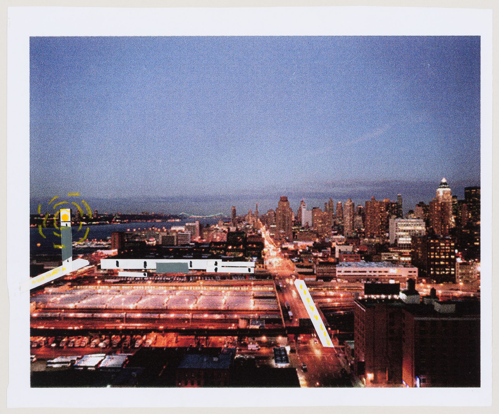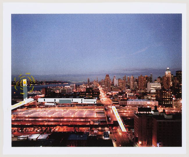 Cedric Price. IFCCA Prize Competition, view of site from south with proposed Hudson Sleeve, laser transmission tower, southern extension to Javits Convention Center and City Sleeve, 1999. Ink, paper and graphic appliqué film over inkjet print on paper, 29.8 × 42.1 cm. IFCCA Prize Competition for the Design of Cities fonds. CCA Collection, DR2004:0360:002