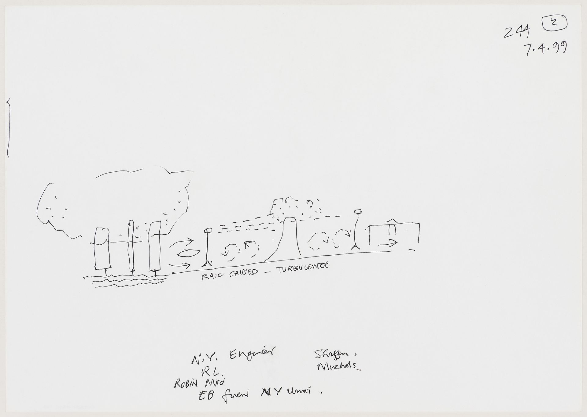 A continuous enclosed public promenade fronting the Hudson bank. The Sleeve extends across the entire site, providing a high-level view for the pedestrian at a height of approximately 20 feet above the river bank. The sleeve’s horizontal section acts as a continuous aerofoil, while providing partial shelter to the ground-based pedestrian. Access to and from the Sleeve will be at each end, appropriate to the overall design of the Hudson River Park.