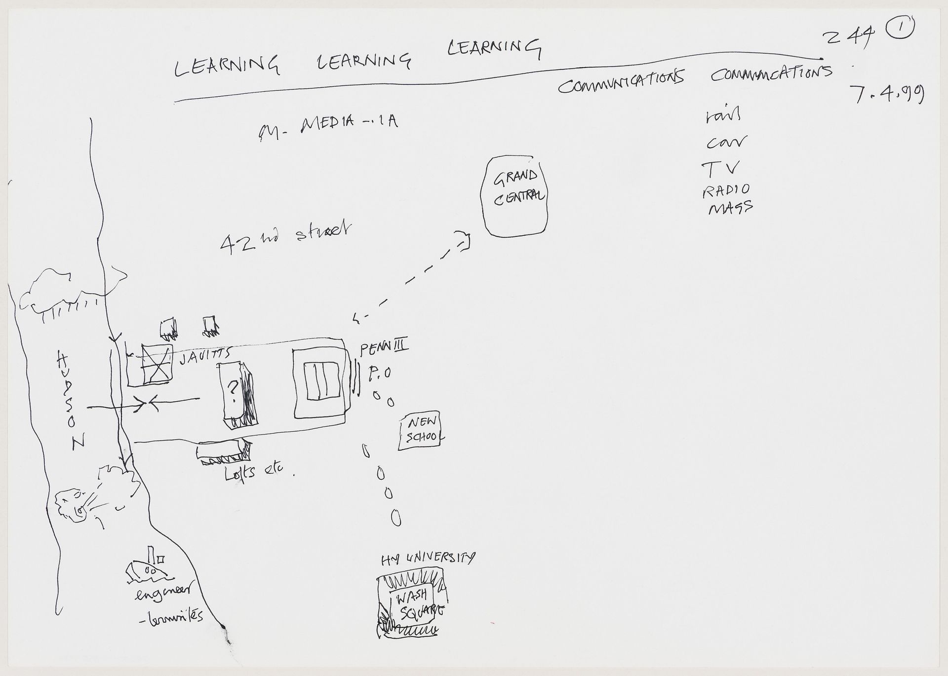 Cedric Price. IFCCA Prize Competition. view of site with proposed structures (laser transmission tower, Hudson Sleeve, Javits Convention Center South Extension and City Sleeve), 1999. Yellow coloured pencil on paper, ink on paper, grey paper and yellow coloured pencil over colour electrostatic print on paper, 17.8 × 21.6 cm. IFCCA Prize Competition for the Design of Cities fonds. CCA Collection, DR2004:0358:005