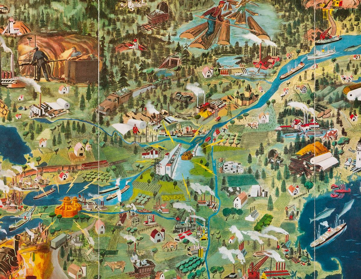 The river now known as the Saint Lawrence runs 3 058 kilometres from the farthest south-western headwater to its mouth, draining the Great Lakes Basin into the Atlantic Ocean. It is into this natural channel that the Saint Lawrence Seaway and Hydroelectric Project is embedded. The finalized project was one of the major engineering undertakings of the twentieth century, generating nearly 1 880 megawatts of power and allowing 20 000-ton ships passage into the Great Lakes. It combined the magnificent natural landscape of the St. Lawrence—one of the earth’s largest water systems formed in an ancient geologic depression—with a mechanized series of locks and channels, a hybrid waterscape fantastic in scale. By expanding the size of existing waterways and constructing new infrastructures, the St. Lawrence Seaway would allow ocean vessels to travel from the sea to the Great Lakes and back again.
