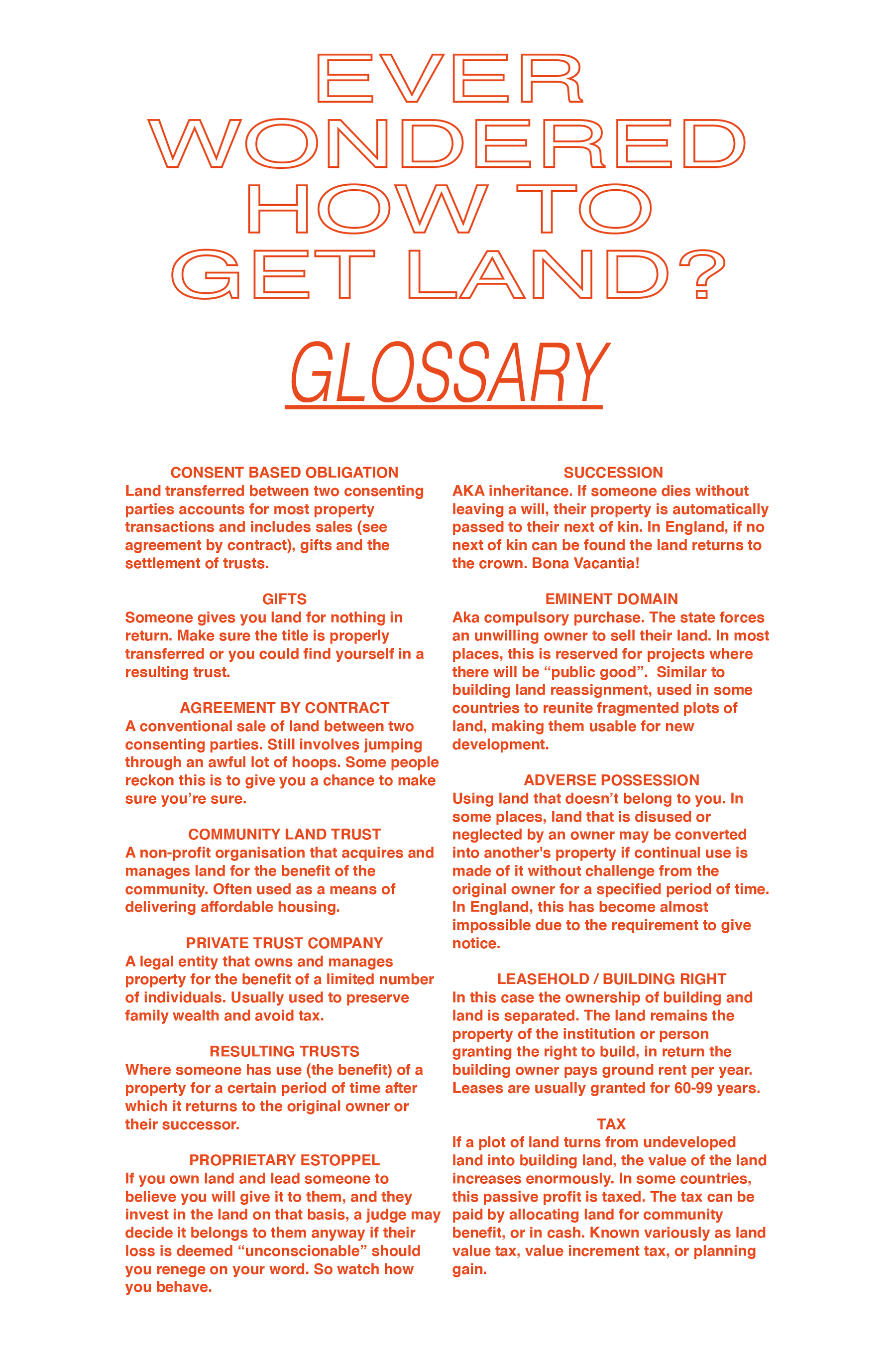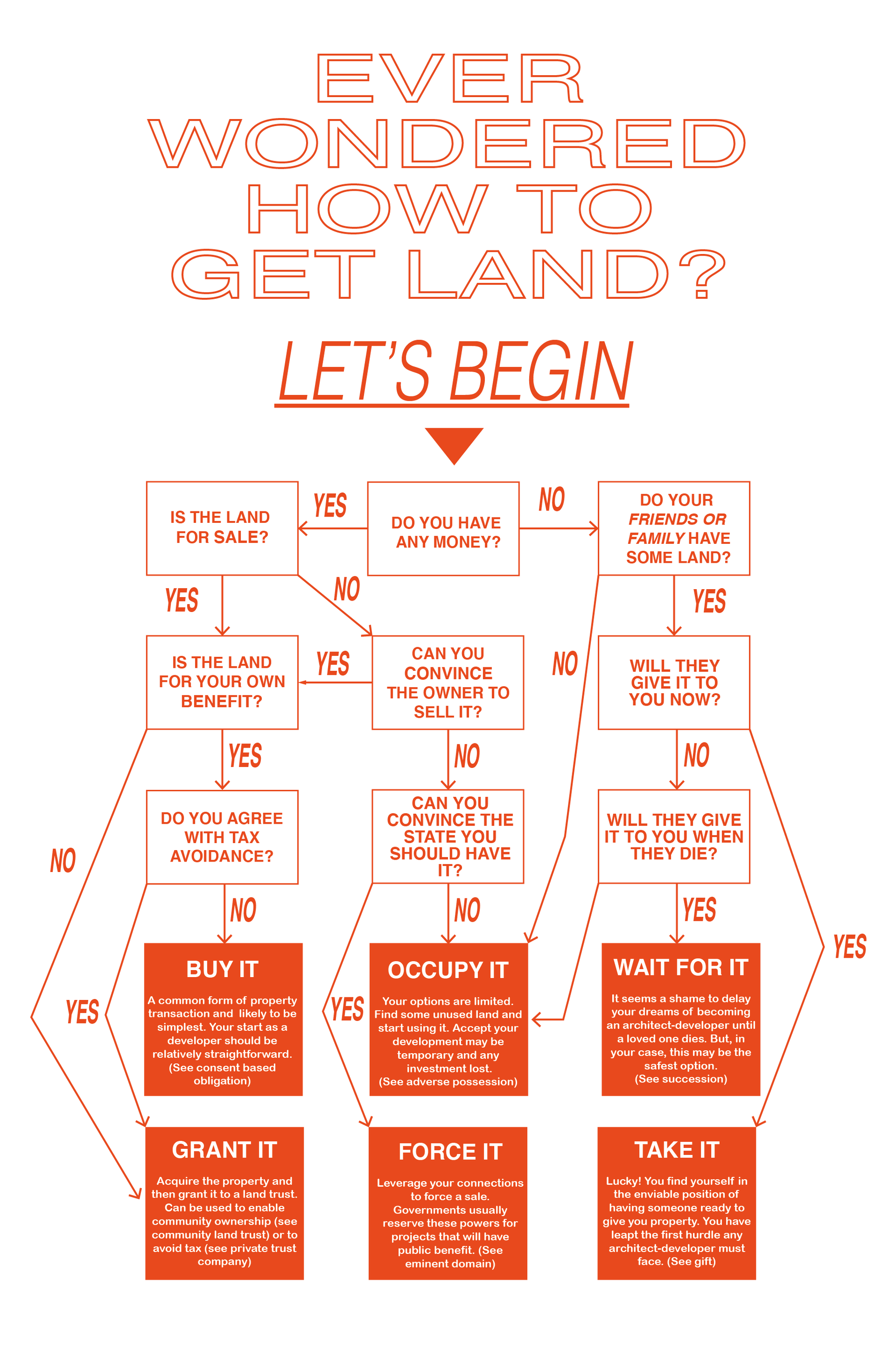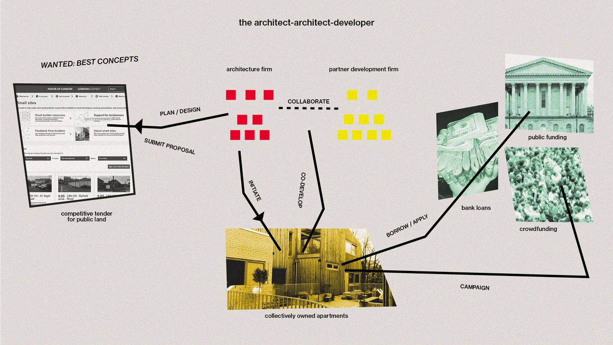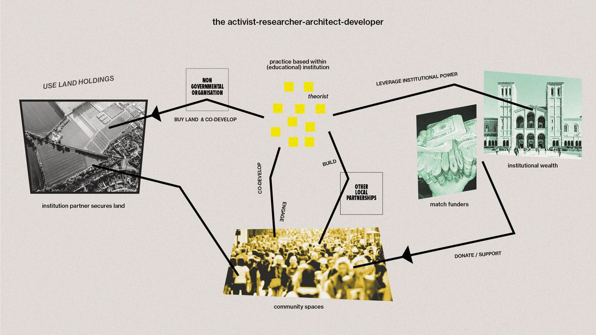 There are models of development that don’t have to be economically extractive. Although it seems like you have no good moves forward, remember that your architectural training, at its best, is a practice of critical proposition. A design tool where you can speculate and then deliver an alternative vision of the future—this is what you should do now. Rather than seeing your work as a personal political project, approach it as a design project instead. If the biggest constraint is your lack of access to capital, which in turn restricts your ability to access land, then maybe owning land is not essential or even desirable for your architect-developer practice. In the longer term you can look at setting up a community-led housing organization. There are many models and forms this might take. Community Land Trusts (CLT) tend to be among the most trusted by public landowners in the UK. Therefore, it’s a good model for opening up more opportunities to access land and funding support. Find key organizations that you can partner with or that you can be supported or mentored by. Start with people that have already achieved what you are setting out to do—they will be generous with their time. Trust in people.