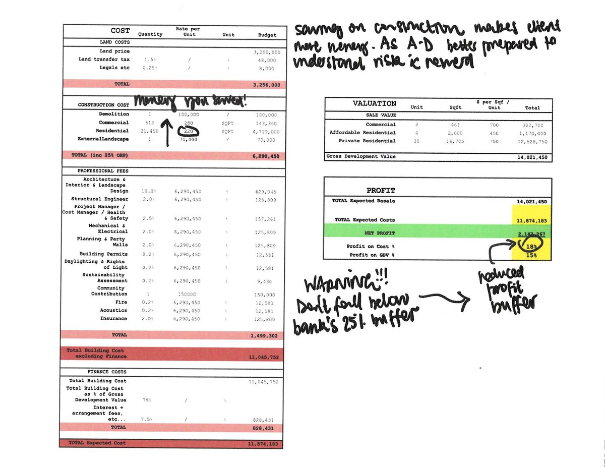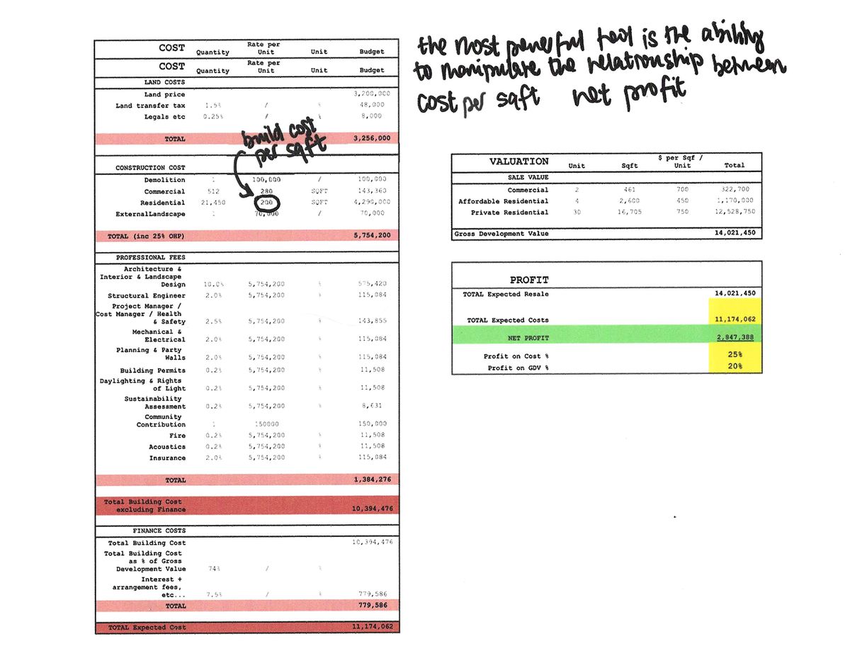One recurring characteristic of architect-developers operating in capital-intensive ways is a high level of financial literacy. They can read a spreadsheet as subtly and tactically as they can read a plan, and are sensitive to the relationships encoded there and pressure points for argumentation and leverage. It is crucial that they can translate these documents for different actors in the building process, especially since those actors often have wildly different appetites for risk.