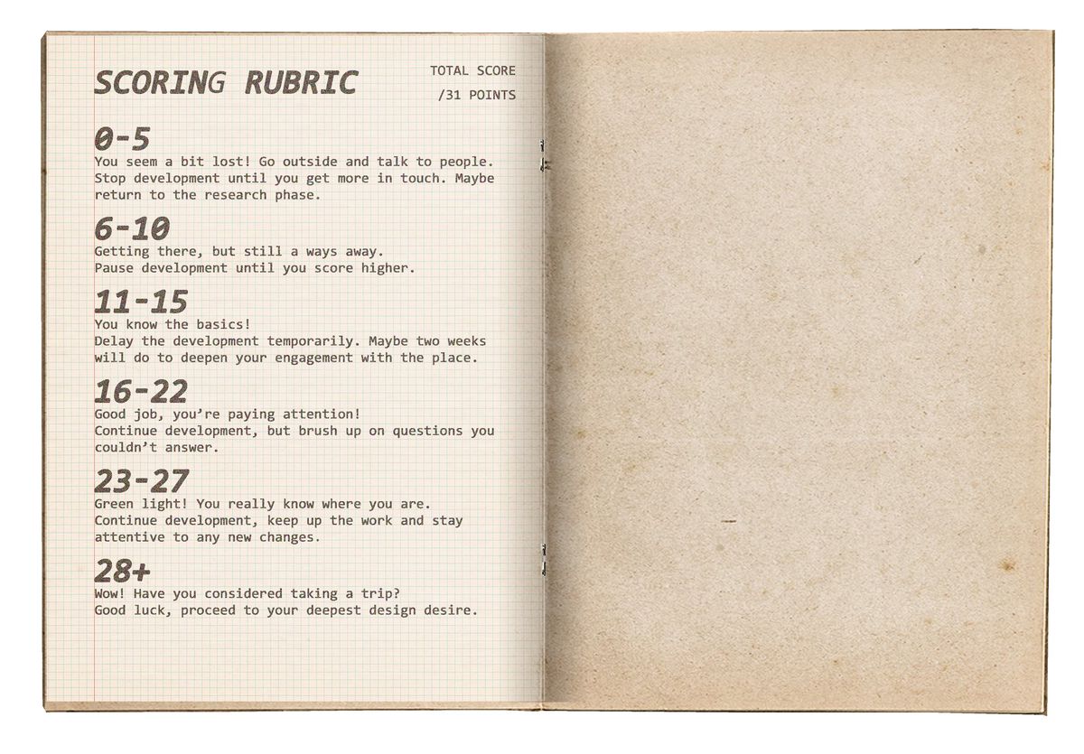 Everything in this publication was made in about fifty hours over three weeks, entirely online, resulting in eighty-seven pages of notes with over twenty-five thousand words. It was only possible because of the dedication of the participants and the generosity of the interviewees: Verena von Beckerath, Teddy Cruz, Issa Diabaté, Elsie Owusu, Amin Taha, Louis Schulz, and Dijana Vučinić. They shared their time with us and then still answered our emails at all hours.