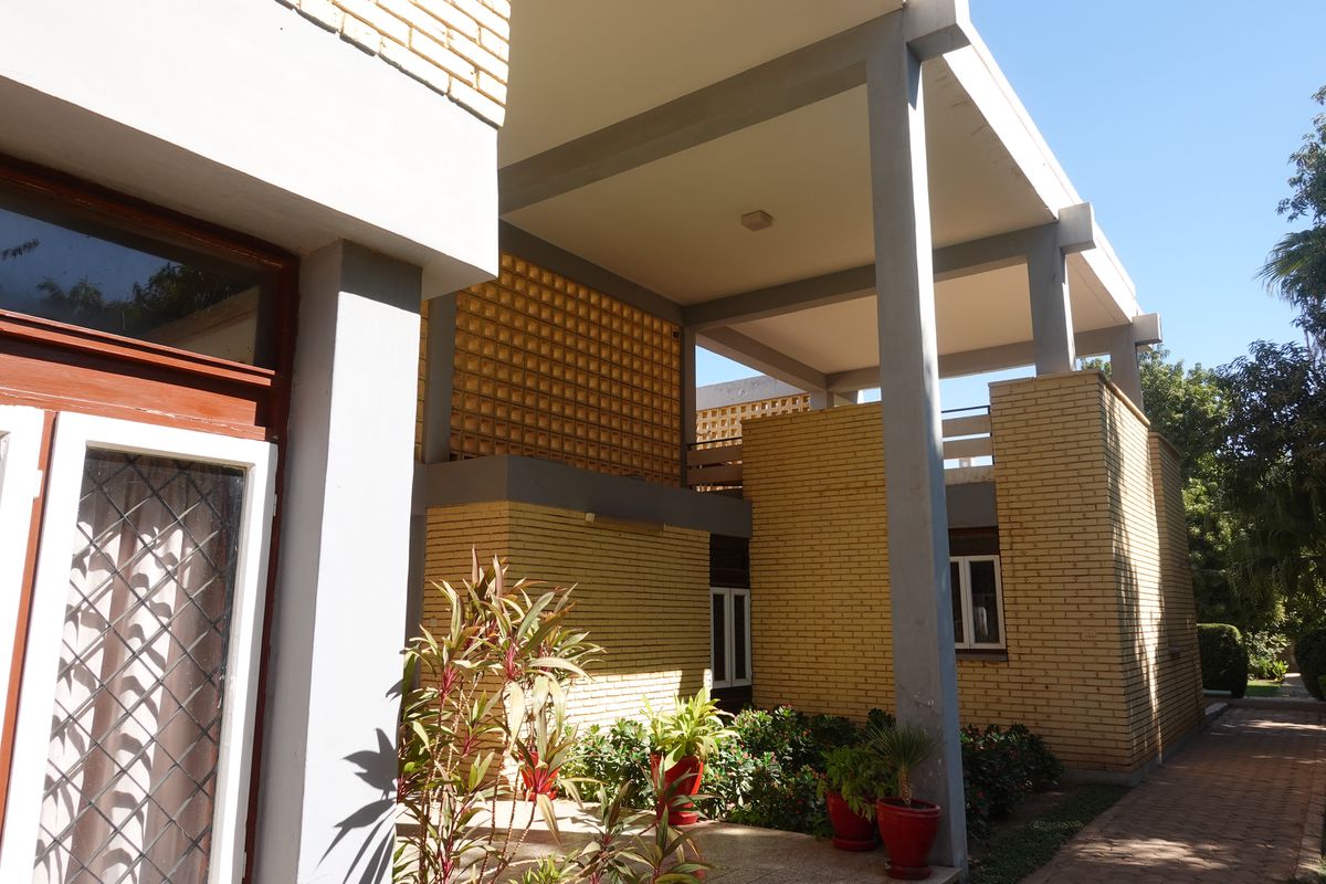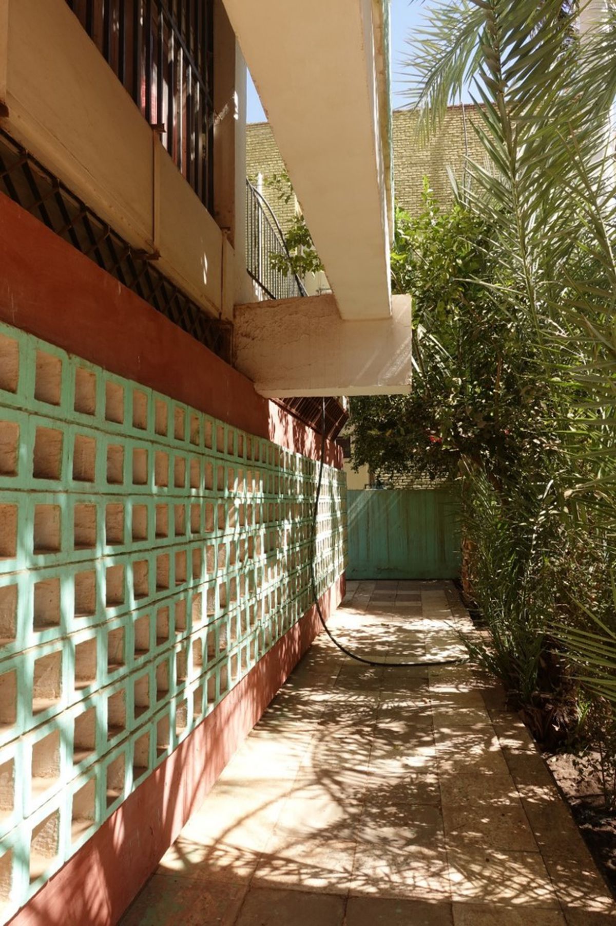 Khartoum professionals often mention Petermuller and Moneim Mustafa together, as the two architects shared many aesthetic and functionalist sensibilities. Both translated verandahs and sun-screening devices into a new modern architectural language in conversation with the international currents of their time. While designing private houses, Petermuller placed the buildings in open spaces and provided ample verandahs just like the colonial architects, but with highlighted reinforced concrete columns and extended beams rather than the classical colonnades of the colonial period. Having designed many private houses, Moneim Mustafa’s career accumulated in a rich set of variations of verandahs, terraces, and sunscreens, all expressed in modular reinforced concrete frames. These houses provide a network of open, covered, screened, and closed spaces for the climate-control of different activities, including open-air sleeping terraces for the night, and shaded socializing spaces for the day. Moneim Mustafa used verandahs both as living areas attached to interior spaces and as circulation paths that were part of the landscaping of gardens. Mahmood Abdelrahim House in Khartoum integrates high street walls into the design that create a courtyard behind, just like Omdurman’s houses; whereas Bedridi Suleyman House in North Khartoum is a freestanding object in a large spacious garden without street walls. Mansour Khalid’s house creates a hybrid relation with the street due to its lifted verandah from where one can see behind the high garden wall. The trees consciously planted outside the solid walls of the Double house in Omdurman both protect the house from over-heating and provide a shaded and paved meeting place on the public street. In his designs for less wealthy collective housing, Mustafa made sure to provide a verandah for each unit, regardless of the modest means. The full set of drawings for “Neighborhood Design” with perspectives of typical houses with verandahs have now been digitized with CCA’s support.