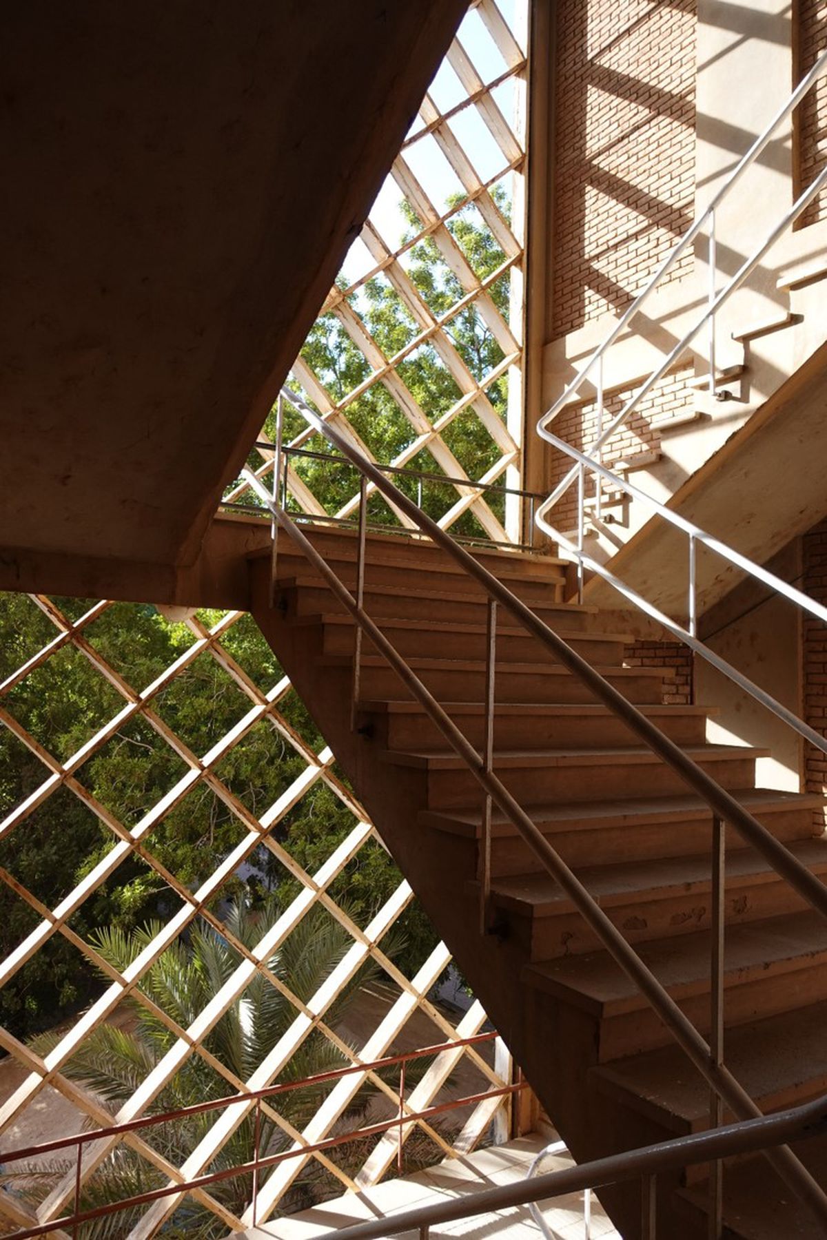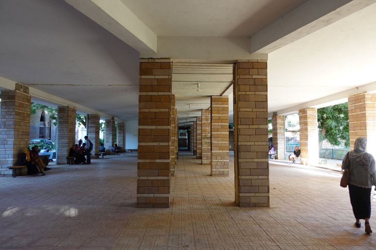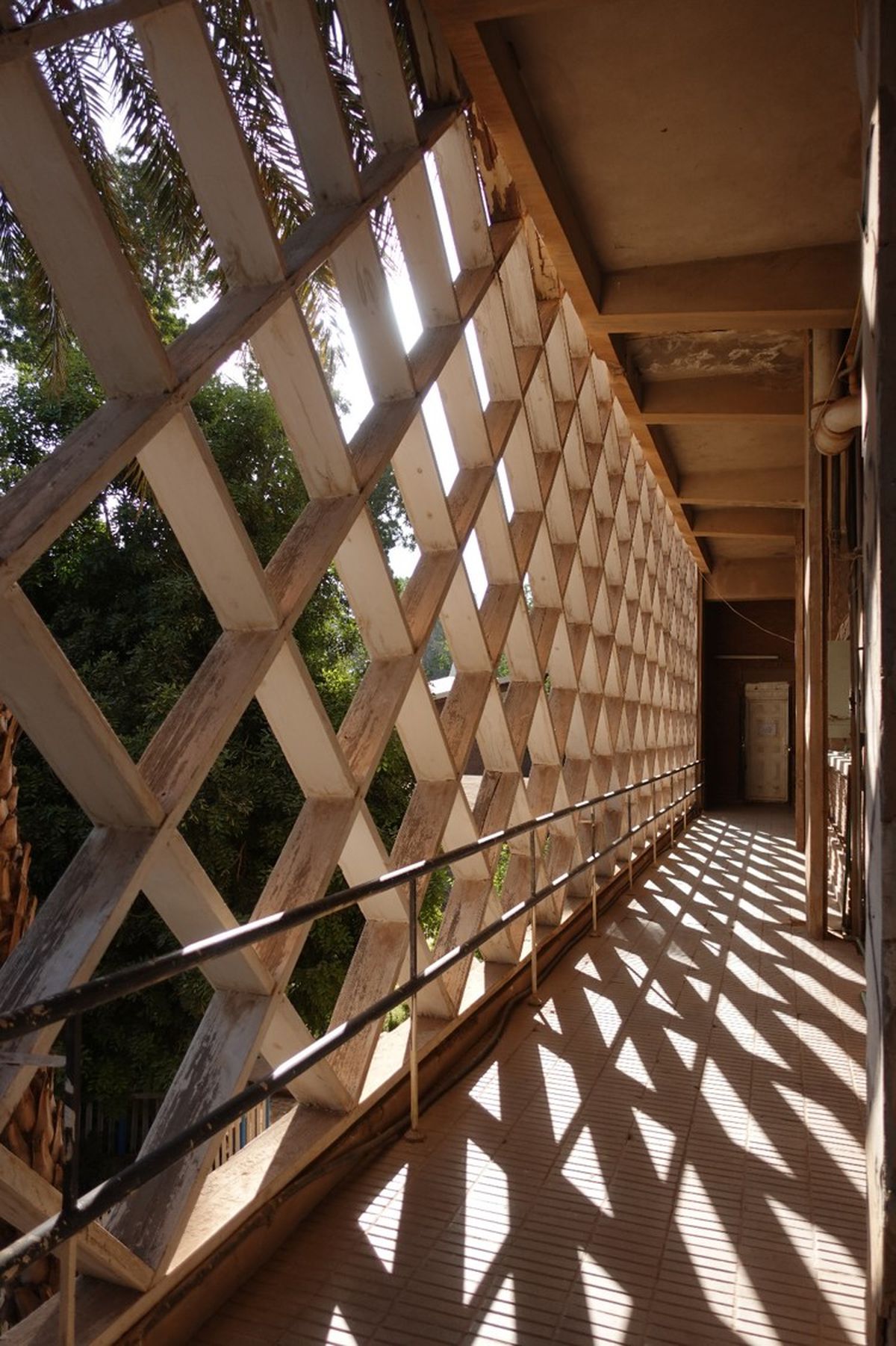 These gestures were carried to public buildings as well. In the Chemistry Lab of the Faculty of Science in the University of Khartoum, Petermuller lifted the entire multi-story building from the ground in order to create a meeting place for students. Today, the area functions as a shaded public space as well as a passageway that links parts of the campus. The memorable verandahs of this building, with tilted wooden grid latticework, protect the walls from the sun and regulate the linear and vertical circulation spaces with impressive shadows on surfaces. The verandah-in-the-air functioning both as a sun-shading device and a socializing circulation space, as well as the most identifying façade element became a repeated pattern during this time. In the Faculty of Architecture, designed in four phases by different faculty members, a protected outdoor circulation network combines programmatic spaces and different levels by also knitting the separate buildings together.