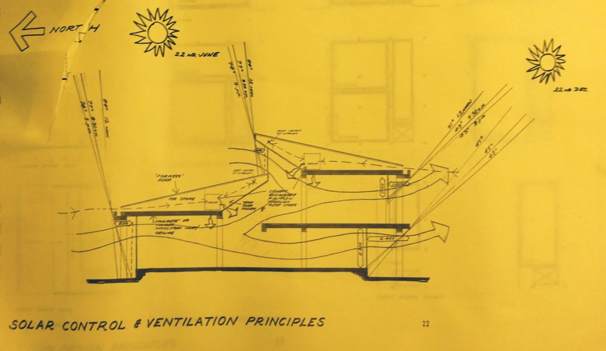 Mustafa continued drawing from the technical know-how that he had gained through the tropical architecture discipline. He used solar diagrams, drew sections of sun and wind control, and explained that climatic concerns “led to a sectional development” which provided north light for studios, and indirect sunlight from the south that entered the building only through a shaded walkway area. The roof with concrete slabs assisted the ventilation with what he called a parasol system and desert coolers.3